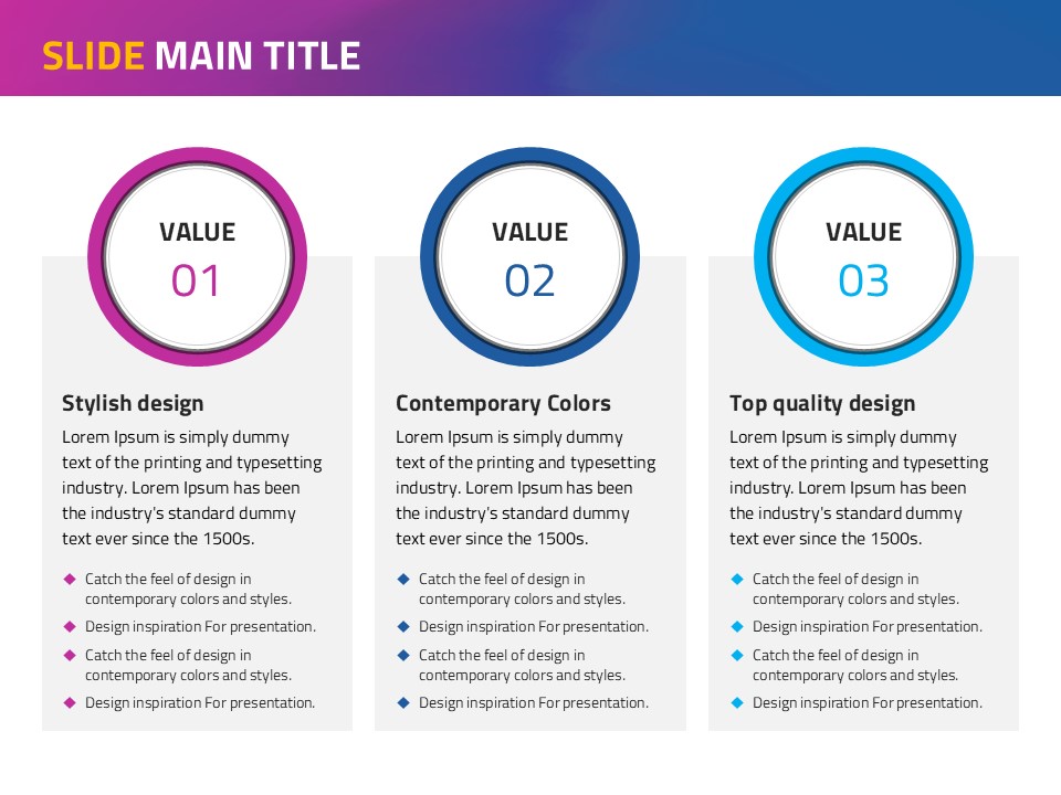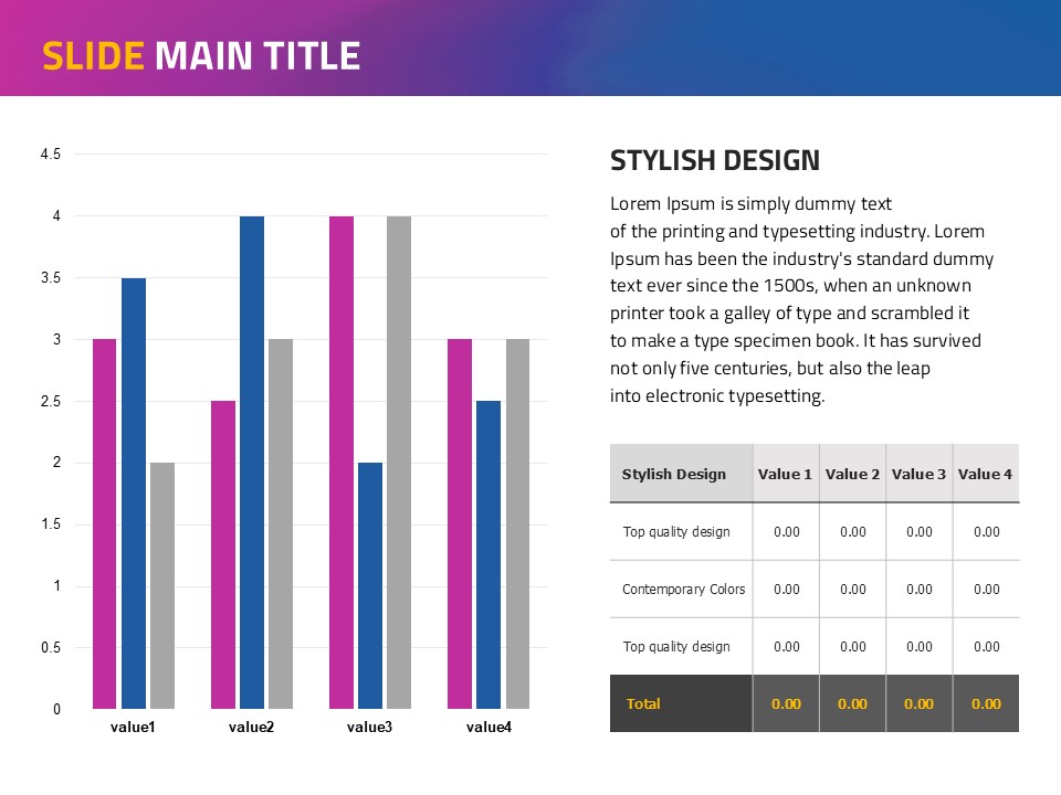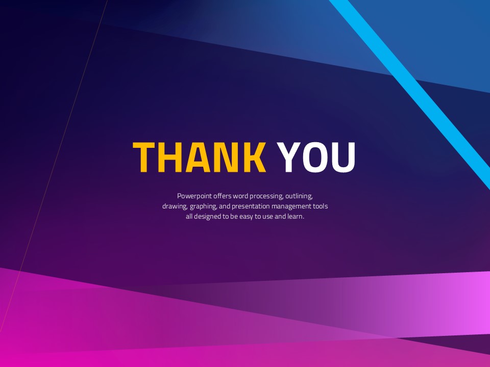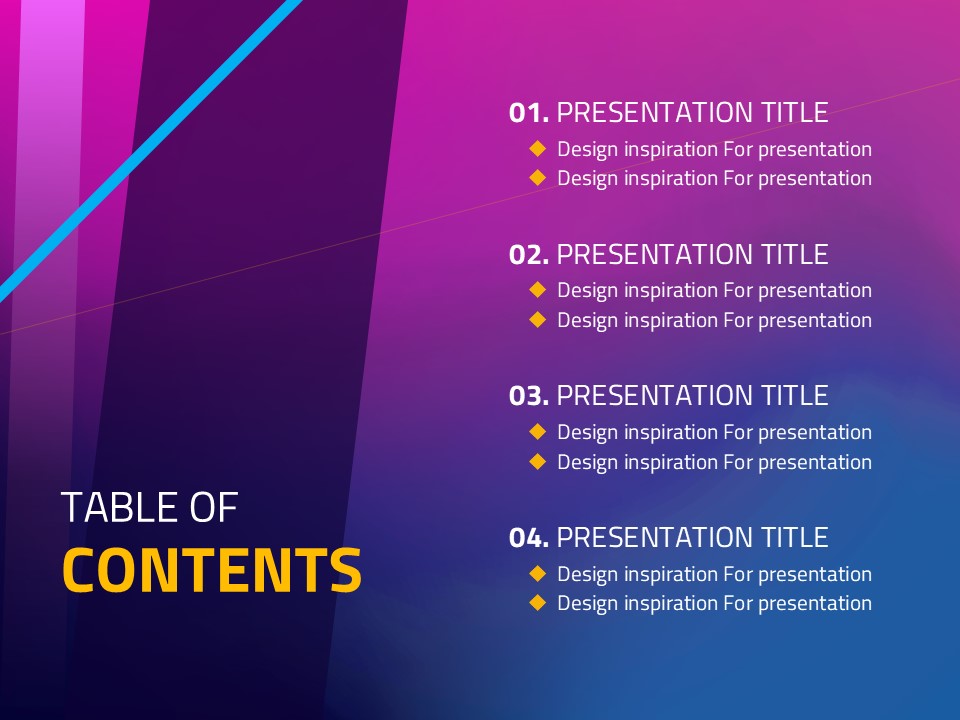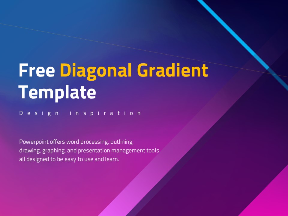 This free PowerPoint template, based on a smooth diagonal gradient, provides a stunning background that effectively conveys your presentation content. The harmonious blend of purple, blue, and yellow elevates visual appeal, making it suitable for any presentation topic. Enhance your presentation with this attractive design! This template is easily editable, allowing for perfect customization to suit your needs.