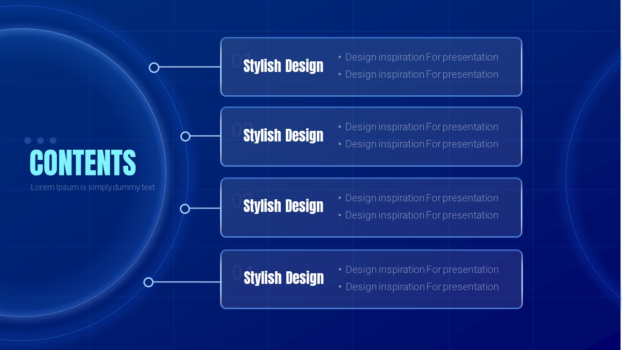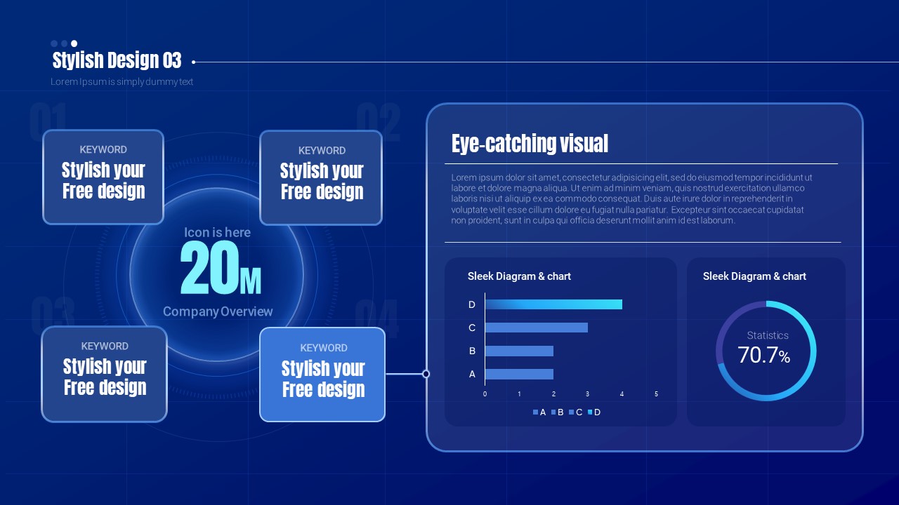 This free Big Data Circle template comprises 6 slides, featuring a stylish design and intuitive layout that effectively supports data analysis and information delivery. Each slide offers a variety of layouts for visually presenting data, enhancing the impact of your presentation. With a harmonious color scheme of navy and blue, quickly convey strong messages tailored to your presentation context using this template.