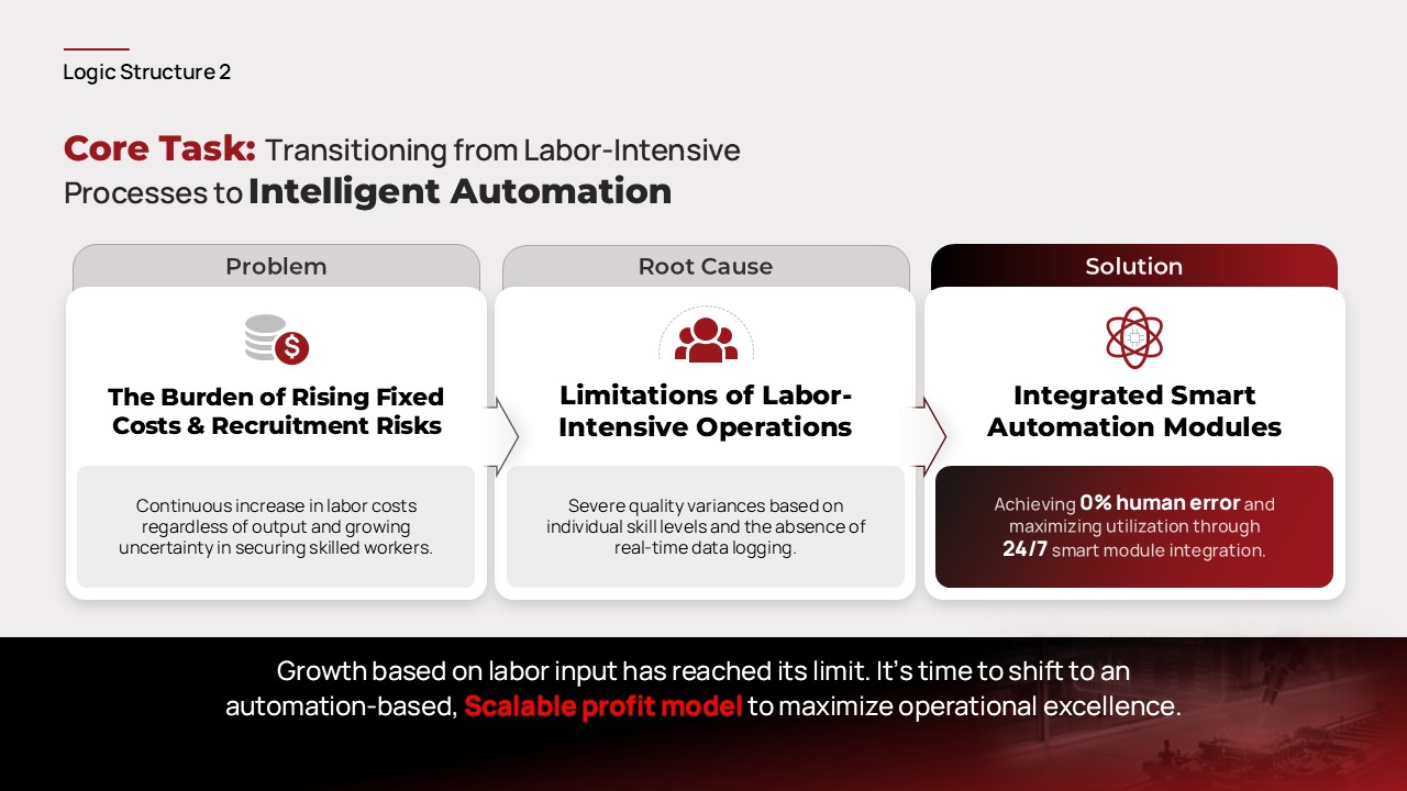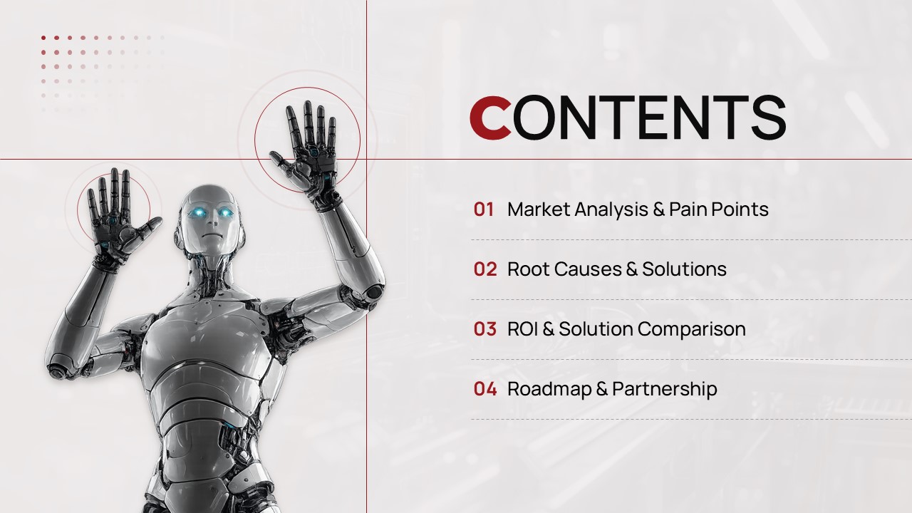 - The presentation is organized into four distinct sections to facilitate a logical flow: it begins with an analysis of the market environment, followed by a clear identification of the core problems, then moves into demonstrating the ROI, and concludes with a well-defined implementation roadmap, ensuring comprehensive coverage of the proposal's key aspects.