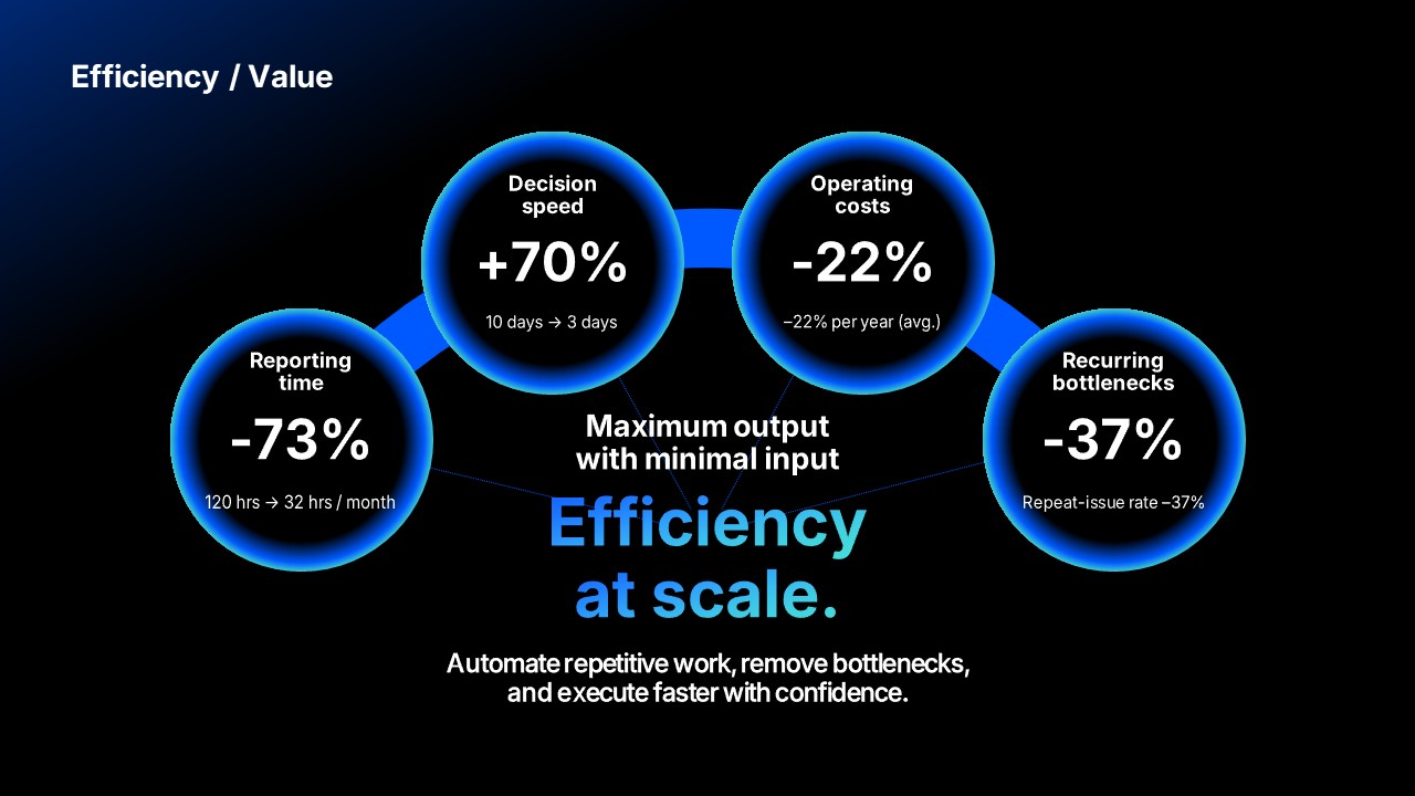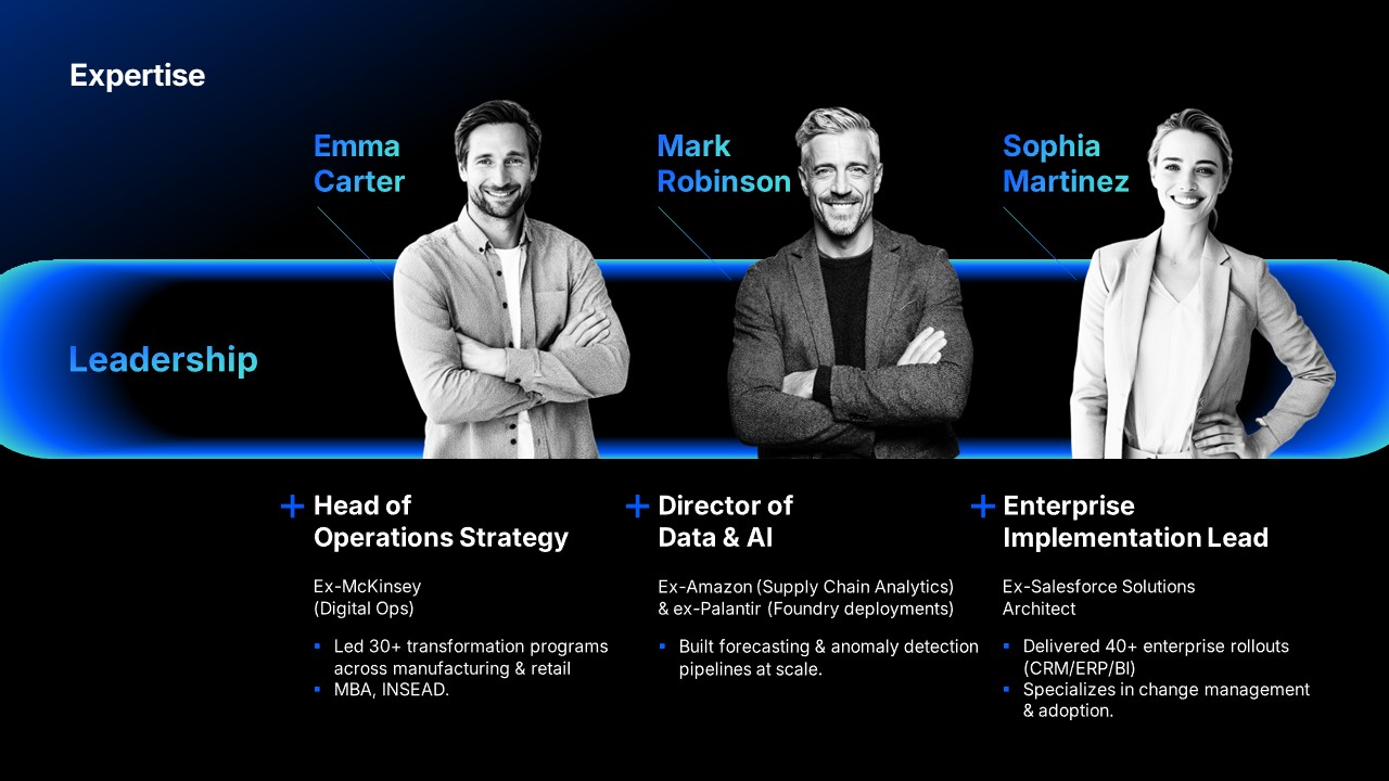 B2B sales and pre-sales teams at SaaS or solution companies pitching to C-level or operations leadership at mid-market or enterprise accounts. Also ideal for startup business development teams that need a company profile deck for investor or partner meetings fast, and for teams whose current profile deck consistently fails to advance deals past the first meeting.