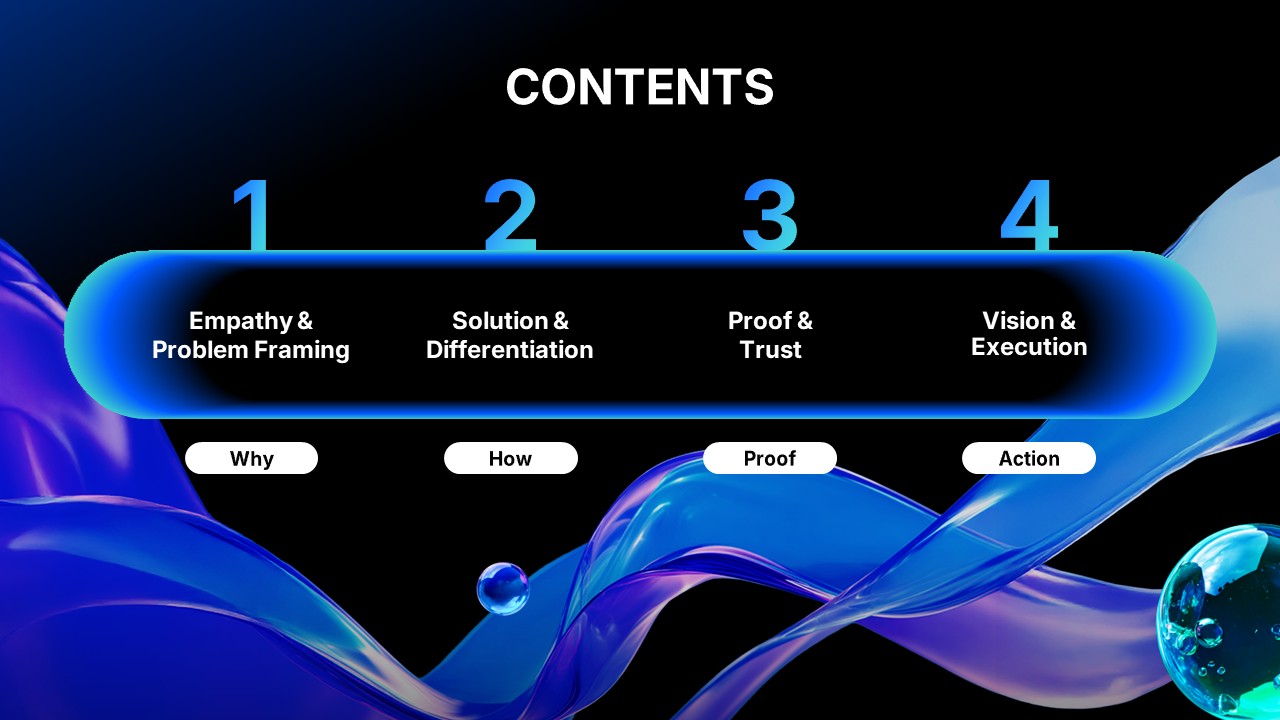 You spend hours building a company profile deck — only to walk out of the meeting with 'We'll review internally.' In most cases, the problem isn't your product or service. It's the structure of your deck. Company profiles that open with founding history, org charts, and service lists fail to hold the attention of decision-makers. For SaaS and B2B solution businesses selling intangible value, a structure that leads with the customer's pain point and backs it up with data is what converts meetings into contracts.