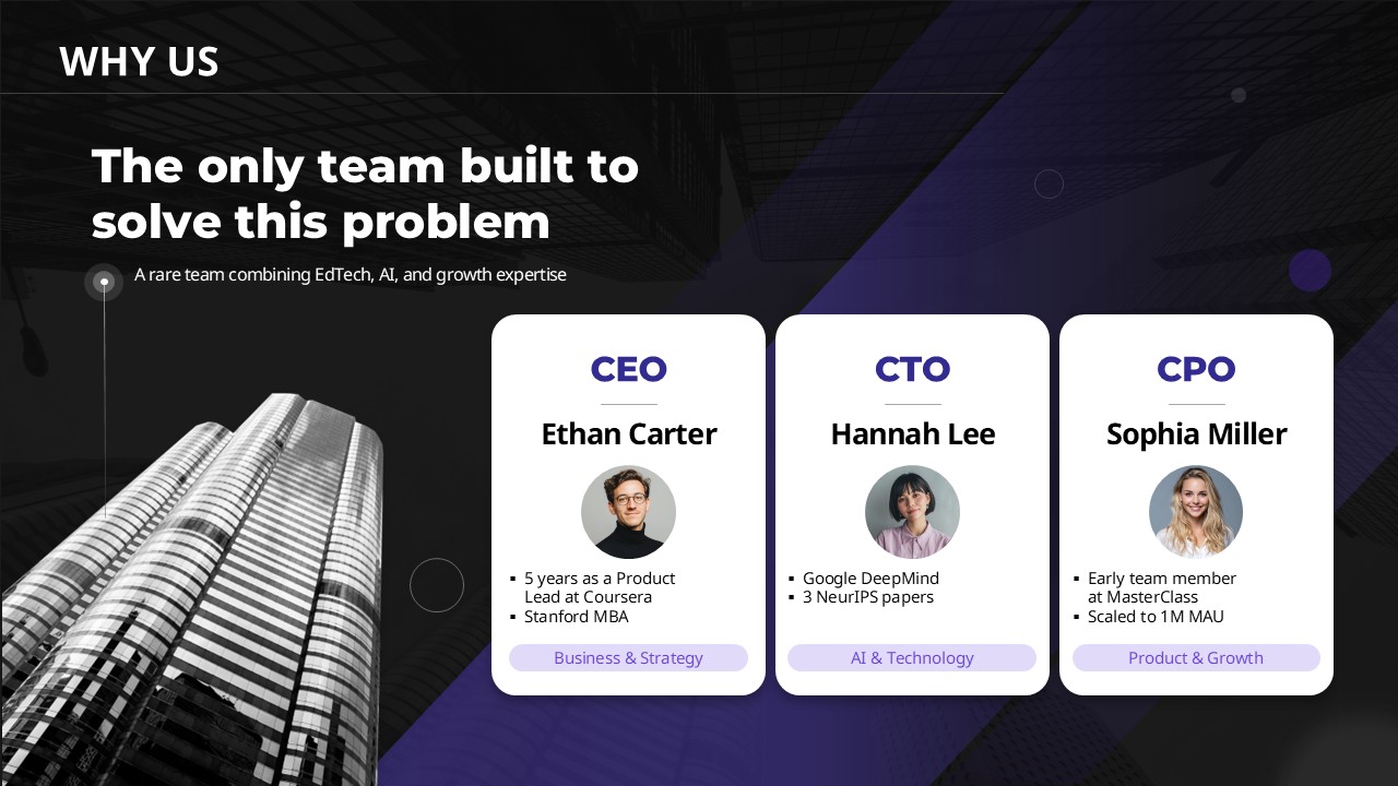This 6-slide pitch deck template is built around the investor's cognitive sequence, not the founder's story arc. Designed with a deep purple and black palette with mint green accents, it covers every stage of the investor presentation: Hook, Problem, Solution, Why Us, Traction, and The Ask. KPI metric cards, Before-After comparison boxes, radial traction indicators, donut pie charts, and team profile cards are all included — the visual toolkit Series A founders need on one deck. Replace the placeholder numbers and team details, and your IR deck is presentation-ready.