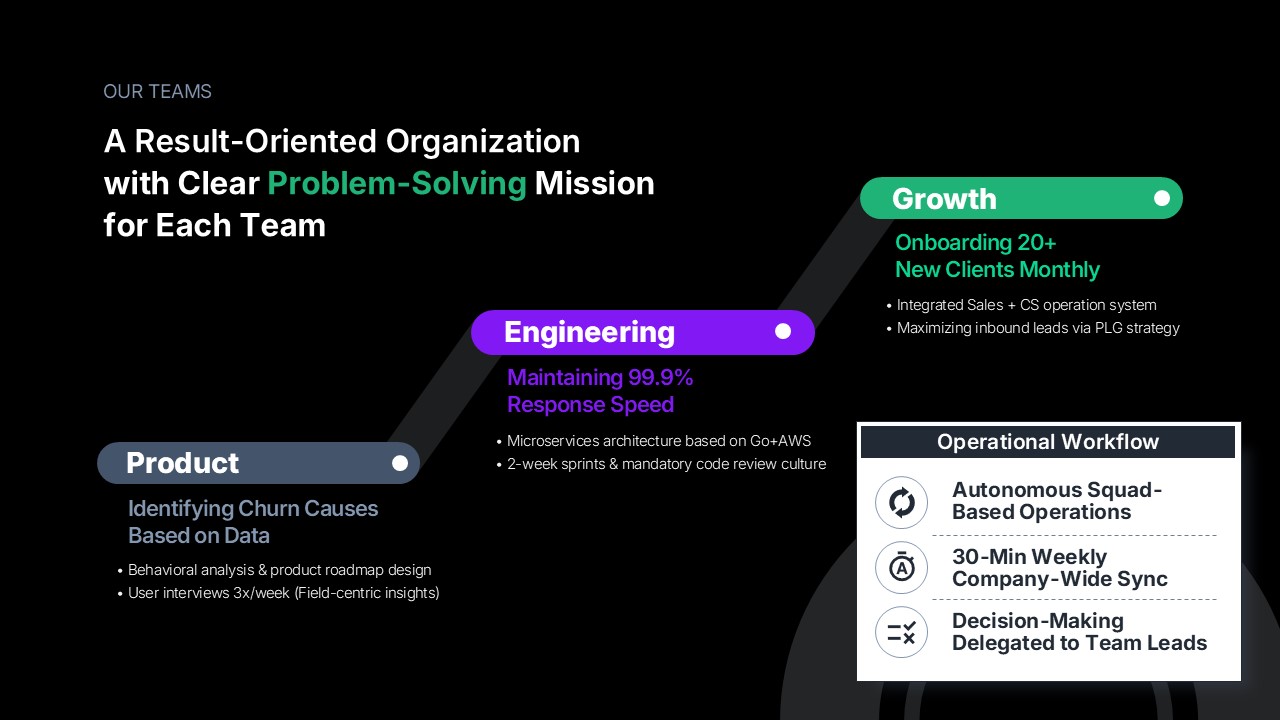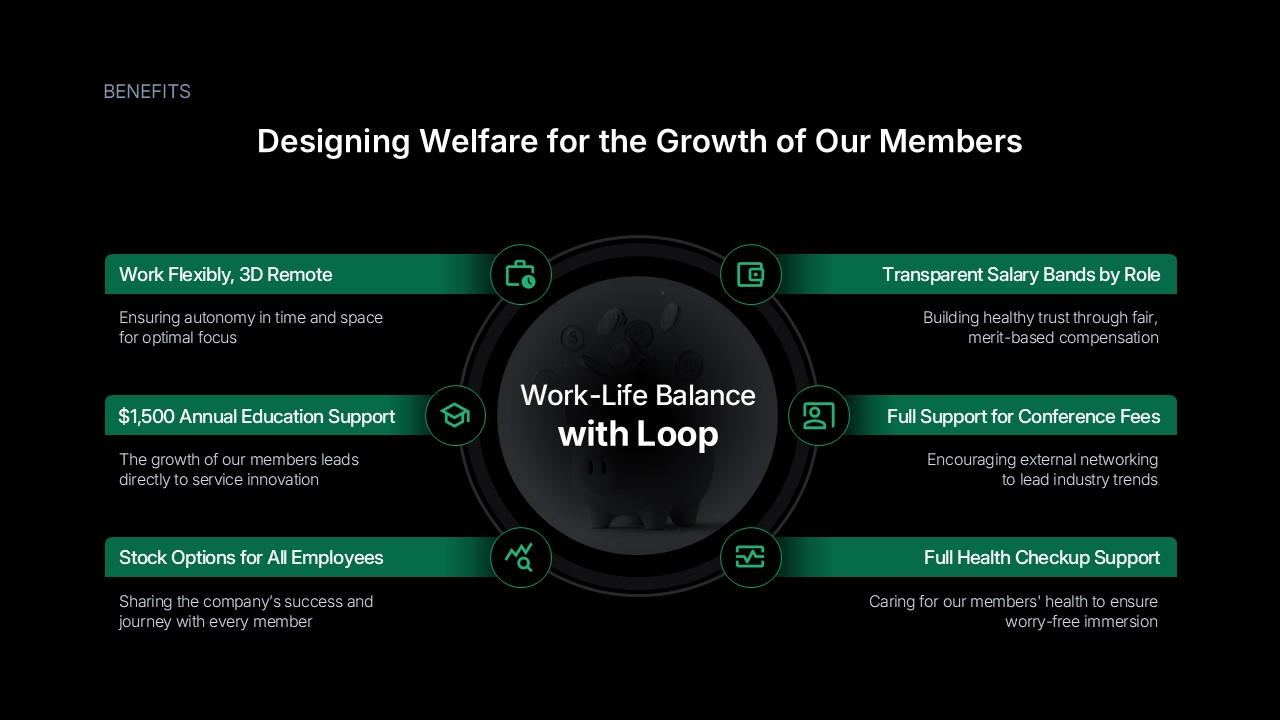 Replace the company traction numbers, mission and vision copy, team descriptions, benefits list, and open role details on each slide — the layout stays intact. Bubble cards, timelines, and diagrams are pre-built; update figures and role titles only.
