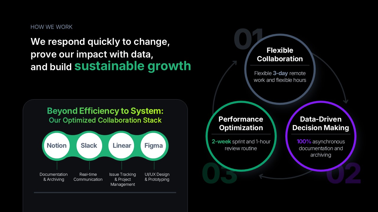 Built on a dark premium design with green and purple accents, this recruitment presentation template reflects the visual language of modern tech startups without requiring any design work on your end. The 12-slide hiring deck covers company traction, mission and vision, team structure, how the team works, career growth timelines, culture, benefits, open roles, hiring process, and a closing CTA — everything a candidate needs to say yes, in one document. Bubble stat cards, timeline roadmaps, and circular diagrams are already laid out; just update the numbers and role details.