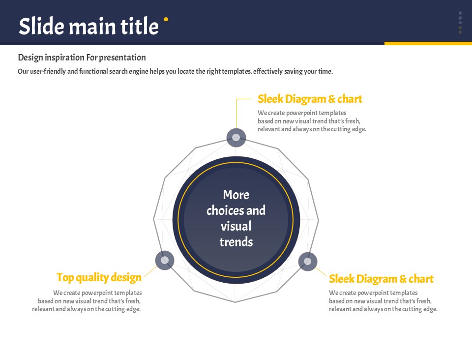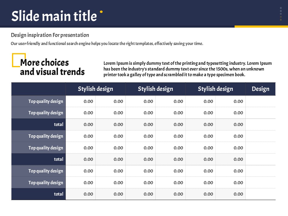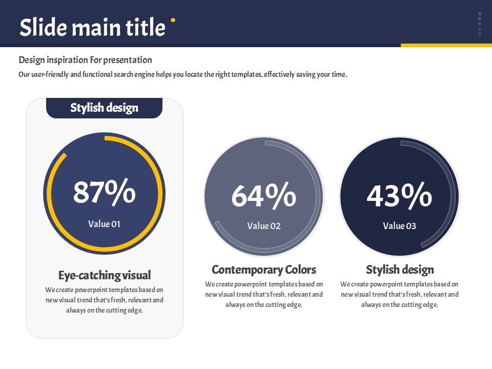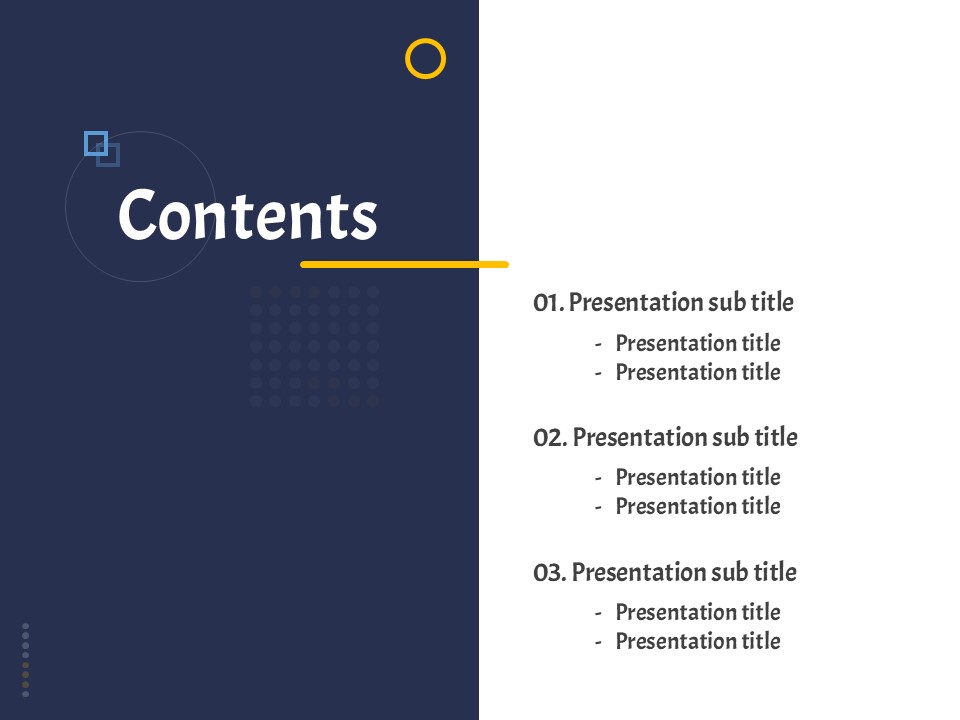 세련된 디자인으로 구성된 이 무료 그래픽 템플릿은 6장의 다양한 슬라이드로 이루어져 있습니다. 남색과 노란색 조합이 돋보이는 깔끔한 레이아웃을 통해 여러분의 프레젠테이션을 한층 더 빛나게 해줄 것입니다. 직관적인 구성으로 정보 전달이 용이하며, 업종과 무관하게 비즈니스 프레젠테이션에 적합합니다. 초보자부터 전문가까지 활용할 수 있는 이 무료 템플릿으로, 즉시 사용해 보세요!