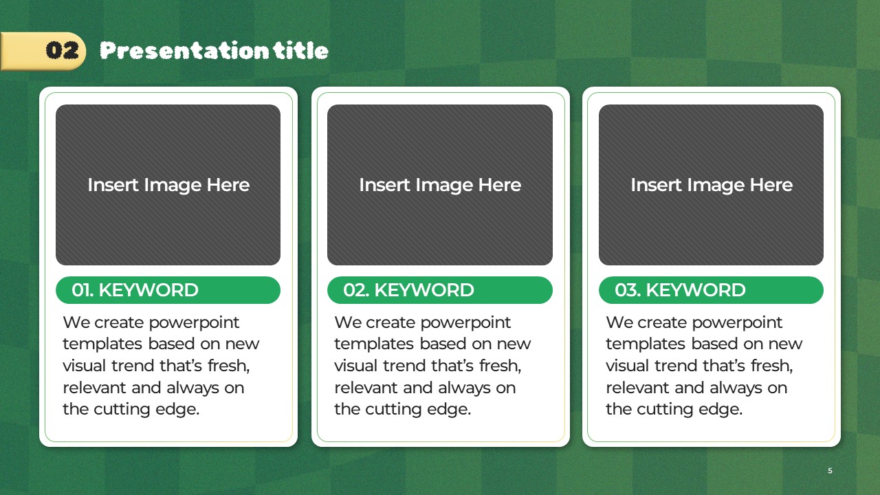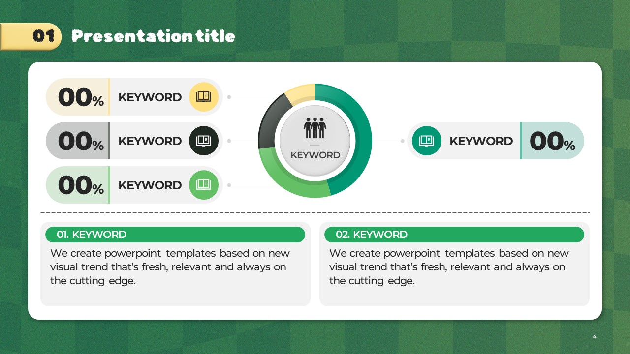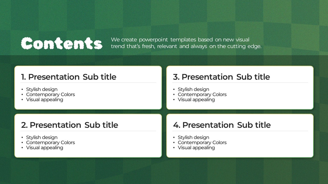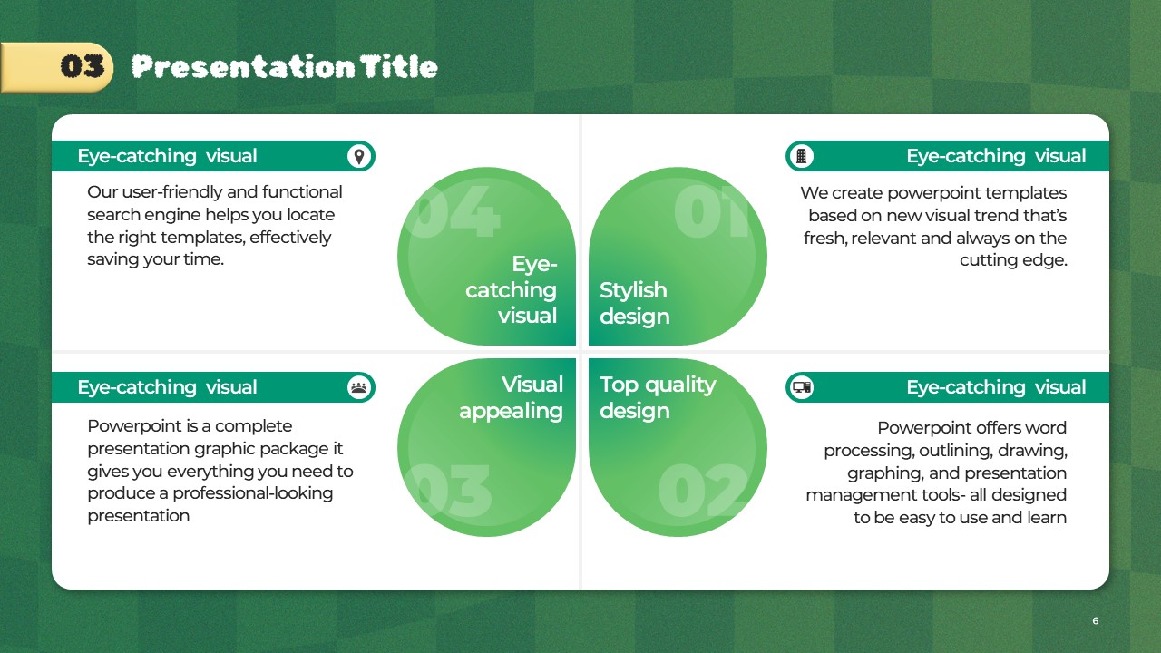 Y&G Checkerboard 무료 PPT 템플릿은 6장의 슬라이드로 구성되어 있으며, 세련된 색상 조합인 초록과 노랑으로 유쾌한 분위기를 제공합니다. 이 템플릿은 비즈니스 프레젠테이션이나 일반 회의에서 빠르고 쉽게 적용할 수 있는 미니 디자인 세트입니다. 모든 슬라이드는 직관적인 레이아웃으로 구성되어 있어 발표자가 필요한 내용을 쉽게 전달할 수 있도록 돕습니다. 다채로운 체크무늬 배경과 깔끔한 텍스트 박스가 어우러져 이 템플릿은 어떤 발표환경에서도 활용도가 높습니다.