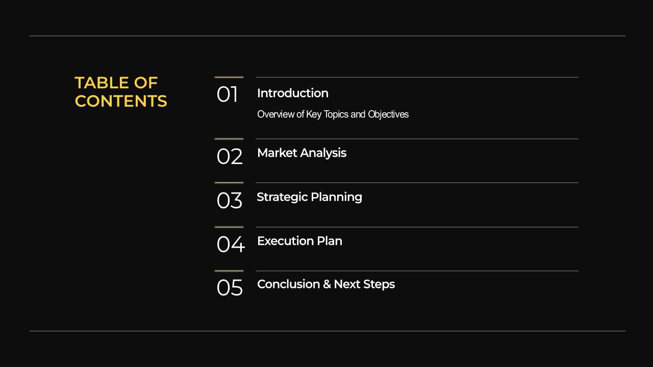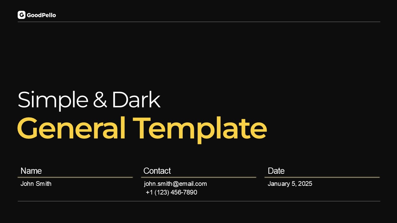 심플하고 현대적인 디자인의 무료 프레젠테이션 템플릿입니다. 6장의 슬라이드로 구성되어 있으며, 세련된 검정색 배경에 노란색 포인트가 특징입니다. 이 템플릿은 명확한 정보 전달에 최적화되어 있어 빠른 준비가 가능합니다. 비즈니스 미팅, 학술 발표 또는 프로젝트 진행 상황 보고 등 다양한 용도로 활용할 수 있습니다. 무료로 제공되며, 전문적인 느낌을 주어 청중의 집중을 유도할 수 있습니다.