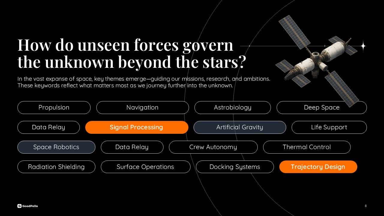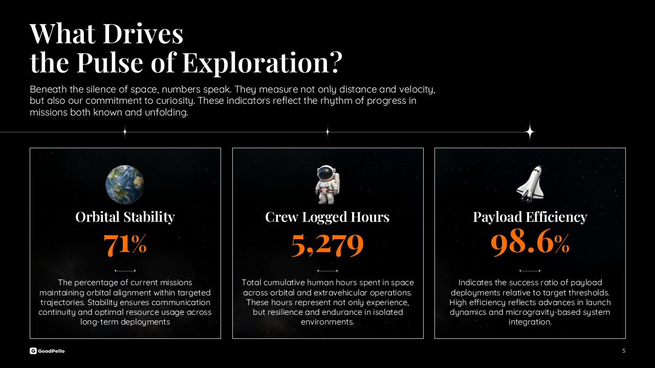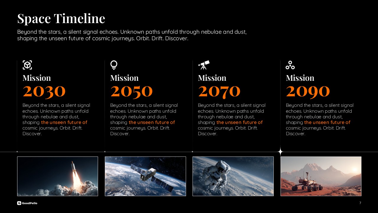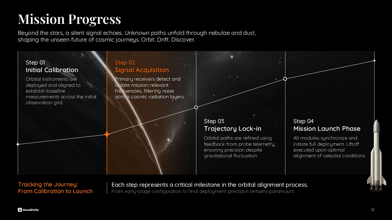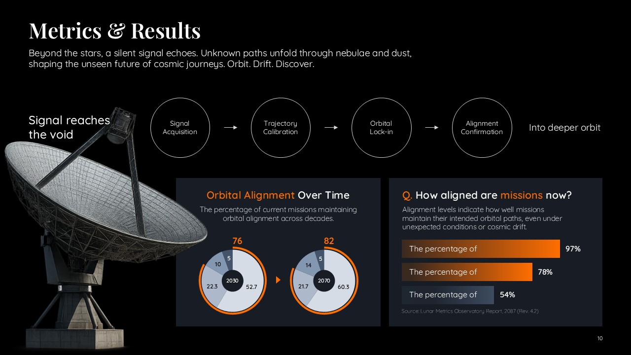 우주 탐사, 과학 연구, 기술 혁신 등 미래지향적 주제를 시각적으로 표현한 프레젠테이션 템플릿입니다.