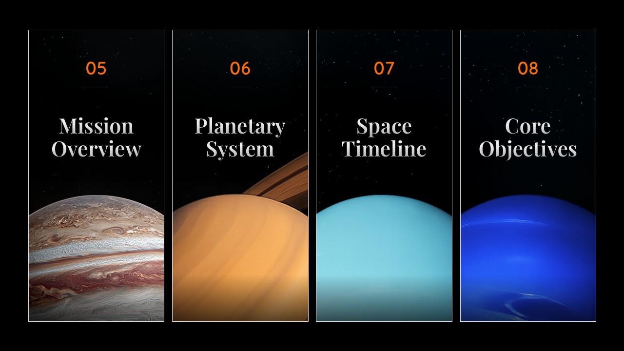 행성 시스템, 미션 개요, 타임라인, 연구 목표 등 논리적 흐름이 명확하게 구성되어 있으며,