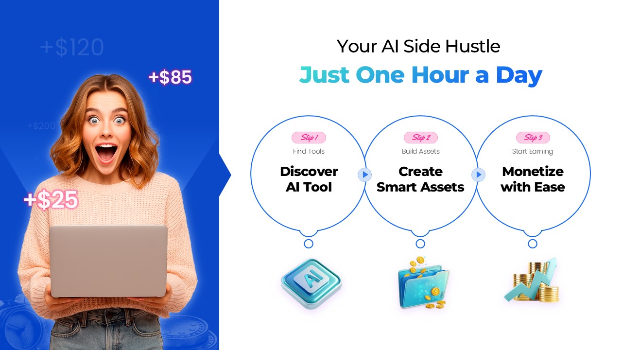이 템플릿은 AI와 디지털 콘텐츠를 활용한 수익 창출, 개인 비즈니스, 사이드 허슬을 주제로 구성된 비즈니스 세트형 프레젠테이션 템플릿입니다.