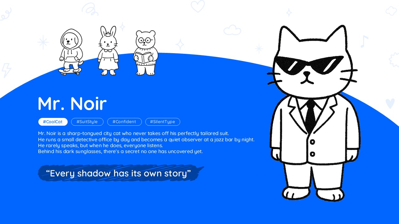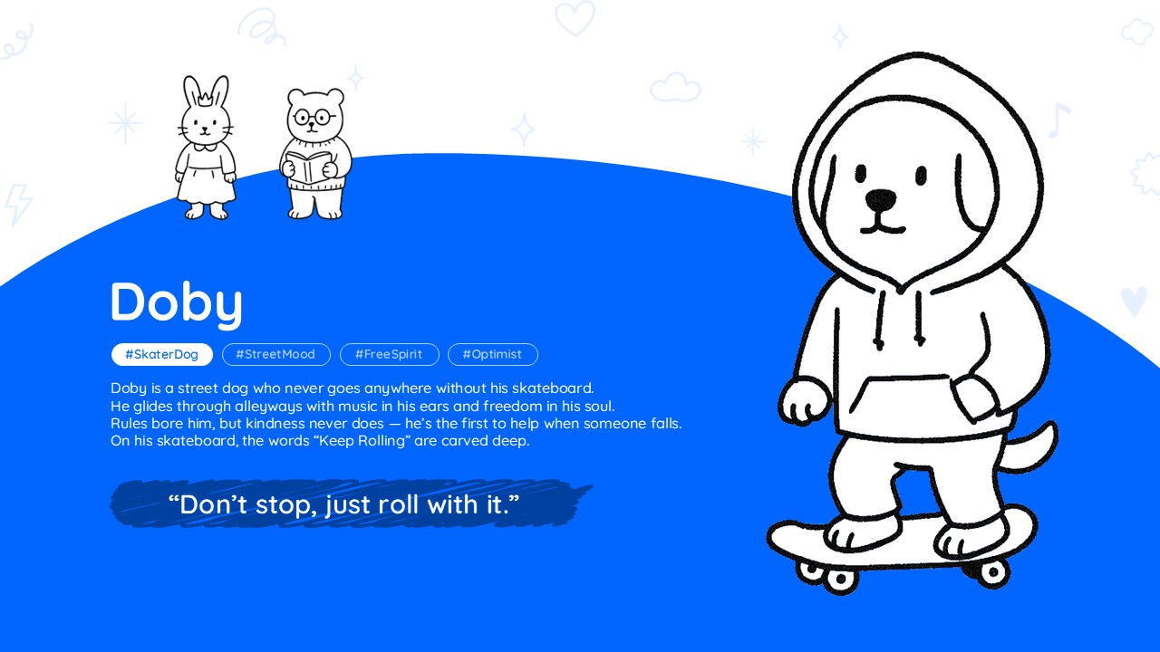 귀엽고 심플한 일러스트 스타일을 기반으로 한 이 템플릿은 캐릭터 소개, 브랜드 스토리텔링, 콘텐츠 쇼케이스, 포트폴리오, 자기소개, SNS 콘텐츠용 자료 등 젊고 친근한 인상을 주는 프레젠테이션에 특히 적합합니다.