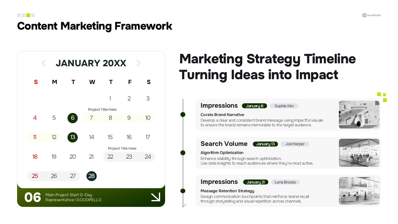 캘린더 형식과 마케팅 전략 타임라인을 결합해 브랜드 내러티브 구축, 검색 최적화, 메시지 리텐션 등 주요 마케팅 활동을 시간 흐름에 따라 한눈에 파악할 수 있도록 구성되어 있습니다. 연간·월간 마케팅 계획 수립, 캠페인 일정 공유, 콘텐츠 실행 로드맵 제시에 적합하며, 마케팅 전략의 실행력을 높이고 팀 간 커뮤니케이션을 명확하게 지원합니다.