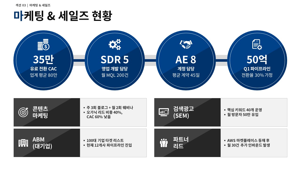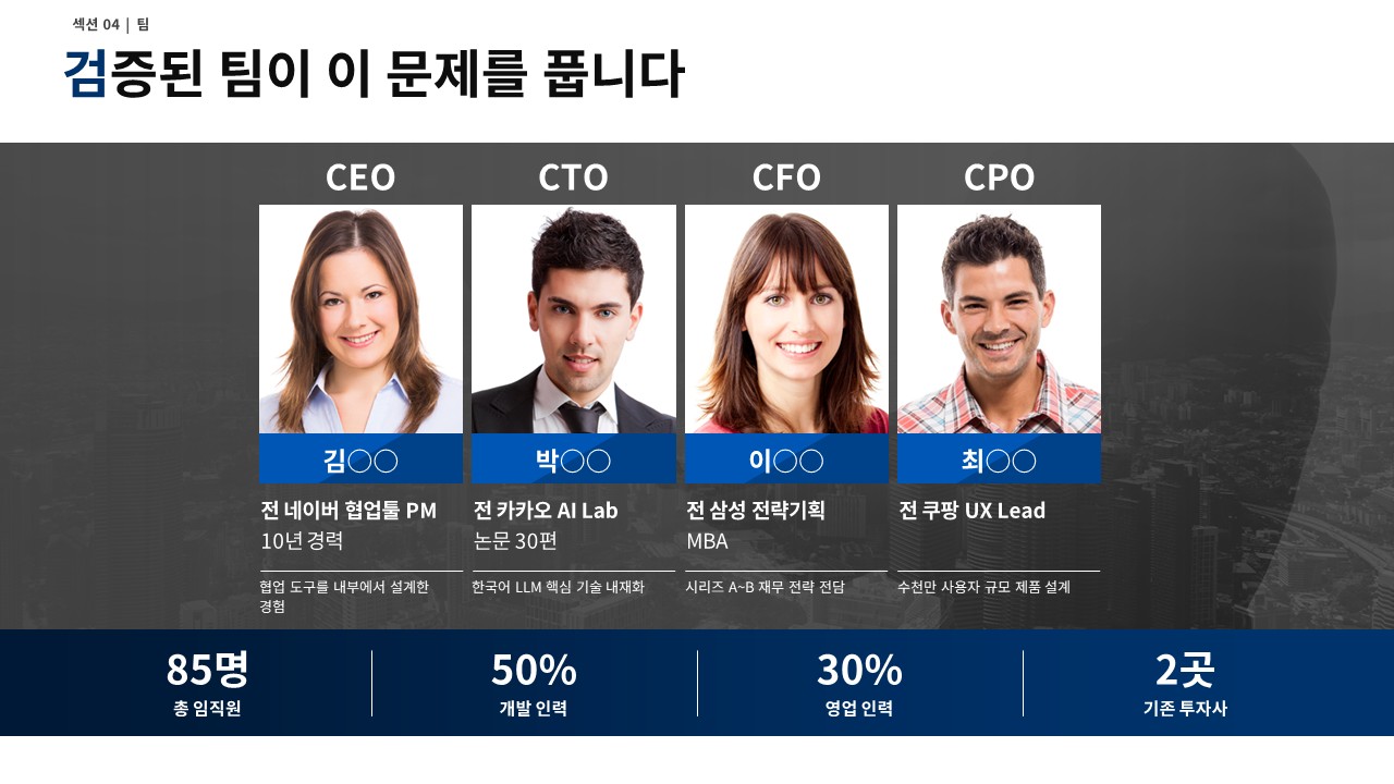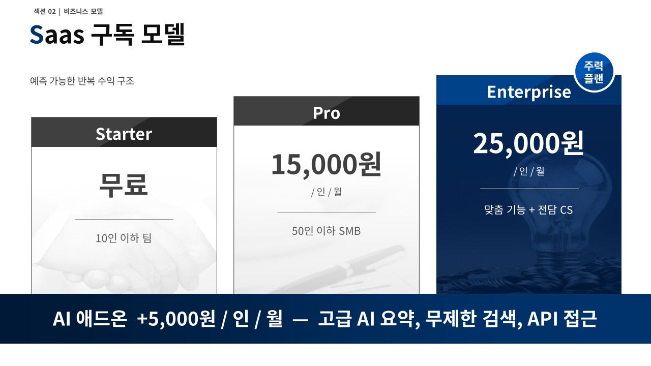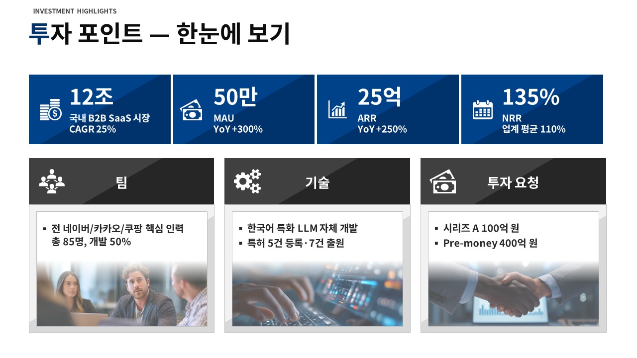 시리즈A 2차 미팅 이후 VC 심의위원회에 제출하는 발표 자료로 바로 활용할 수 있습니다. 발표자 없이 자료만으로 내부 검토를 통과해야 하는 상황, 재무 전망과 Exit 시나리오를 처음 구성해야 하는 스타트업, 투자자에게 리스크 대응 전략까지 제시해야 하는 B2B SaaS 기업에 최적화되어 있습니다.