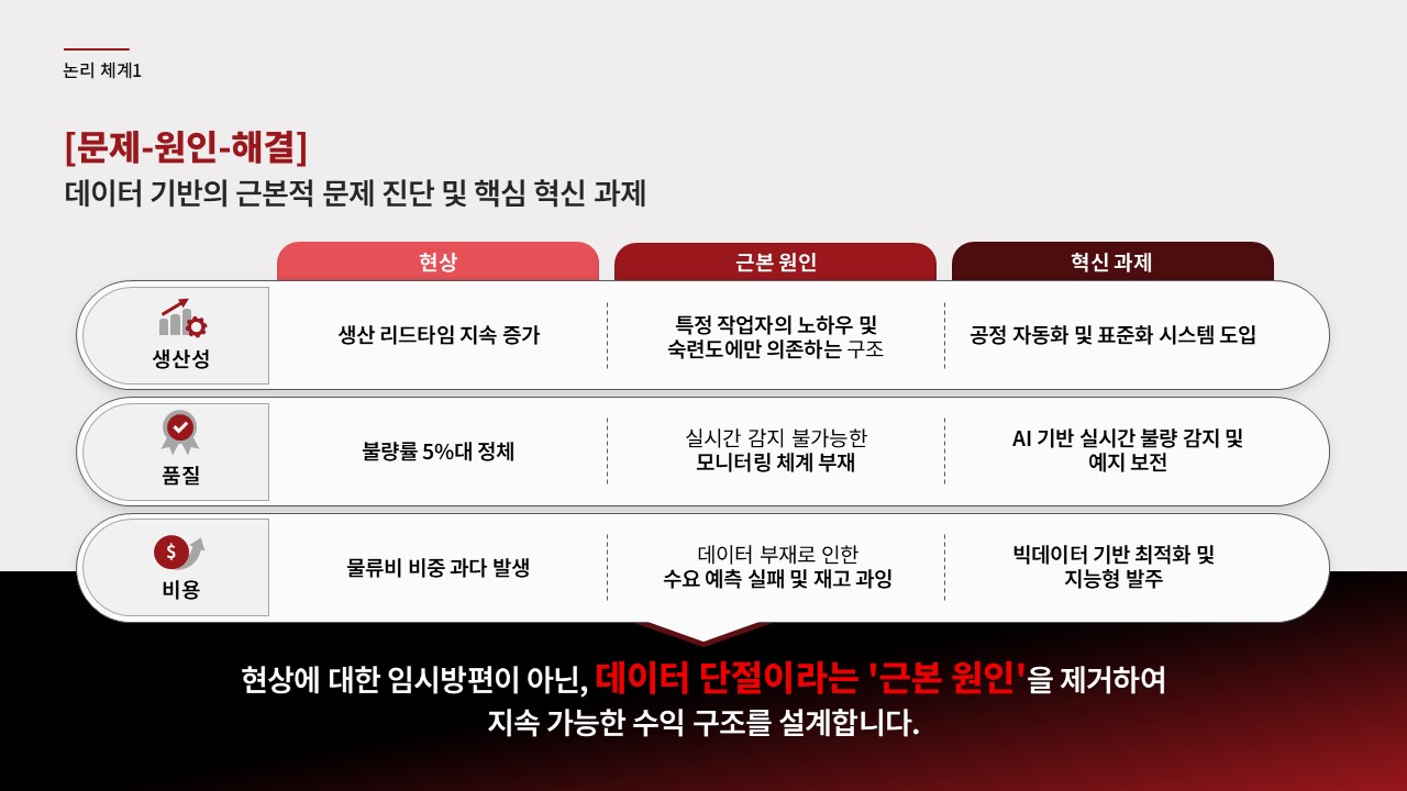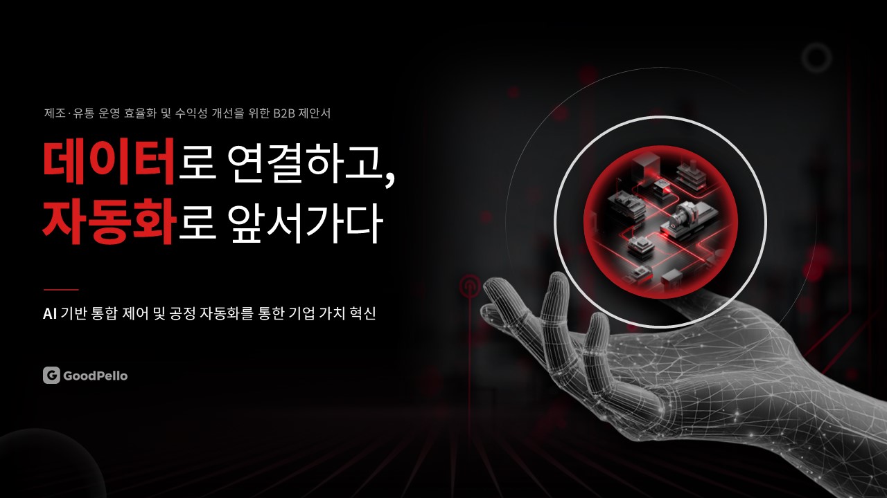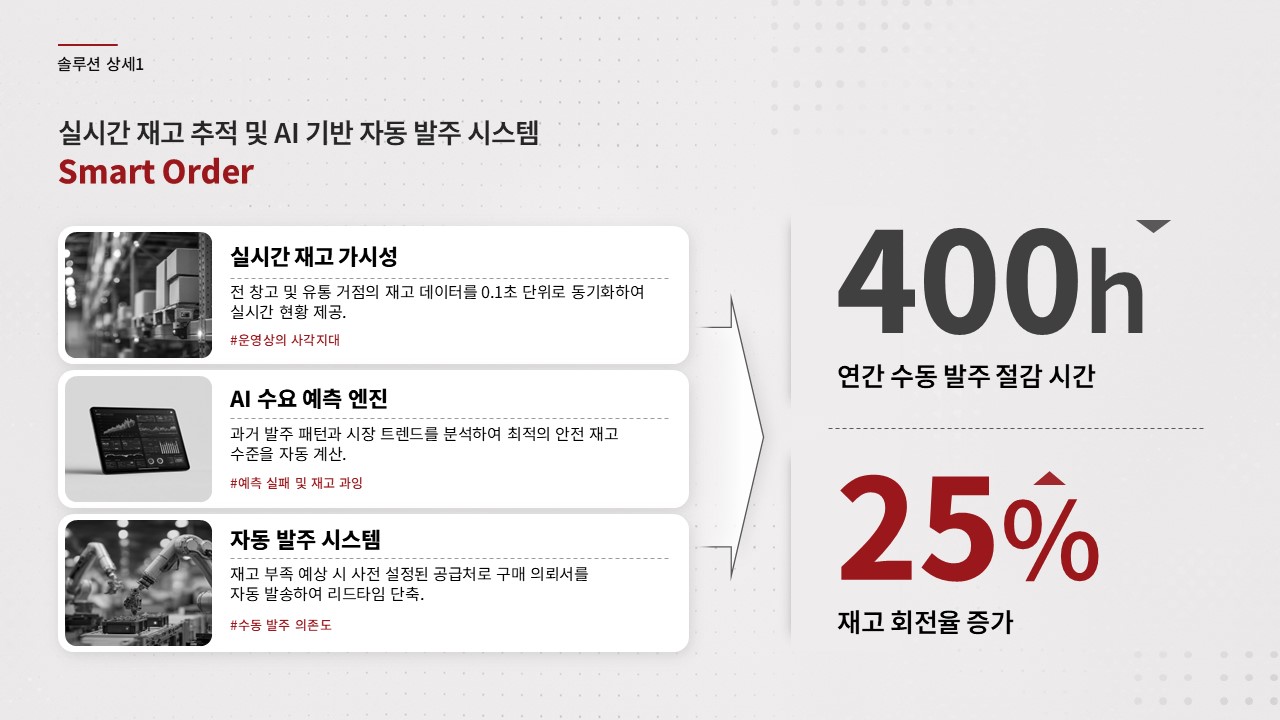 제조·유통 업종 고객사에 AI 자동화 또는 공정 최적화 솔루션을 제안하는 B2B 영업 담당자가 C-레벨 또는 운영 총괄 임원 대상 프레젠테이션을 준비할 때, 초기 제안 미팅에서 경쟁사 대비 기술 우위와 투자 회수 근거를 한 장으로 전달해야 할 때, 기존 제안서의 설득력이 낮다는 피드백을 받고 구조를 전면 재설계해야 할 때 바로 적용할 수 있습니다.