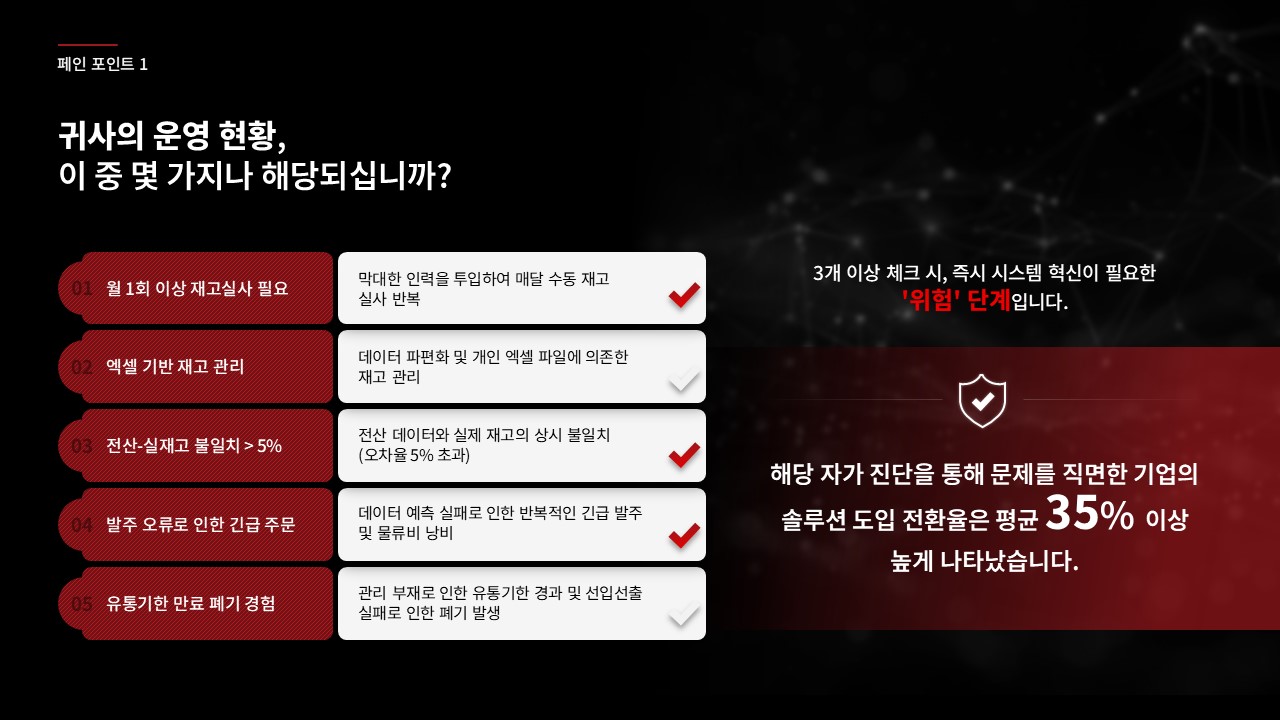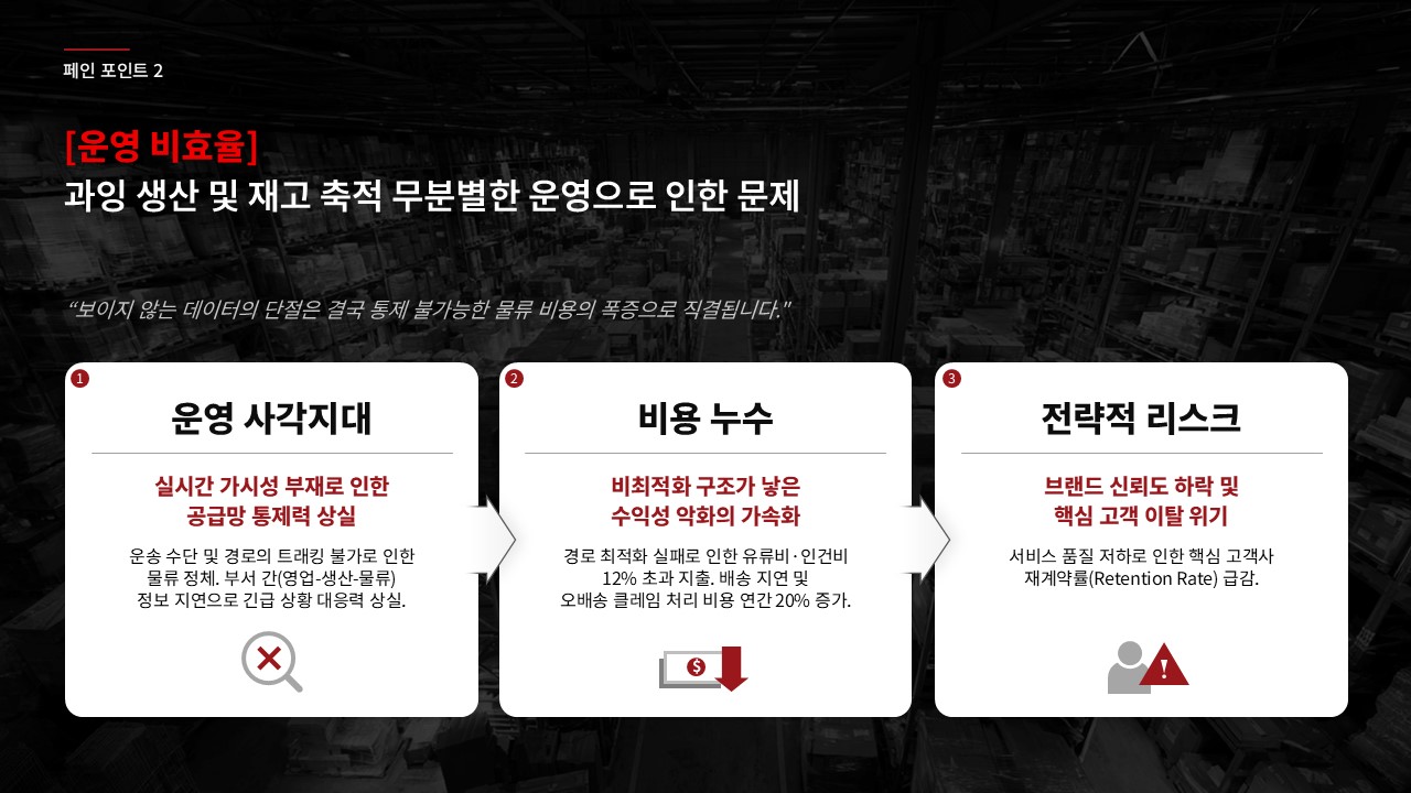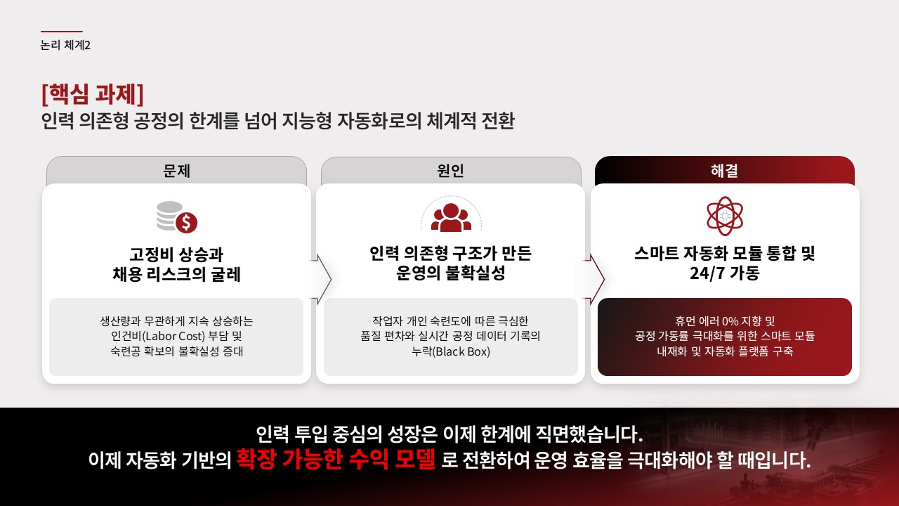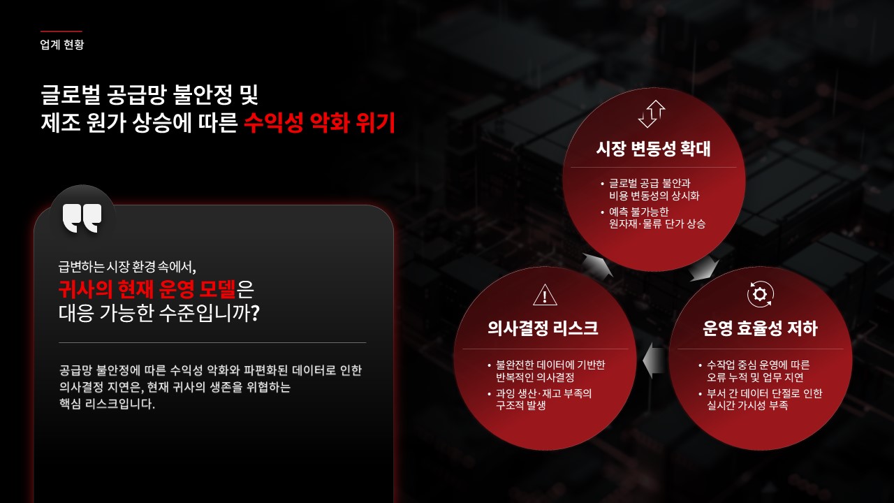 제조·유통 업종 고객사에 AI 자동화 또는 공정 최적화 솔루션을 제안하는 B2B 영업 담당자가 C-레벨 또는 운영 총괄 임원 대상 프레젠테이션을 준비할 때, 초기 제안 미팅에서 경쟁사 대비 기술 우위와 투자 회수 근거를 한 장으로 전달해야 할 때, 기존 제안서의 설득력이 낮다는 피드백을 받고 구조를 전면 재설계해야 할 때 바로 적용할 수 있습니다.