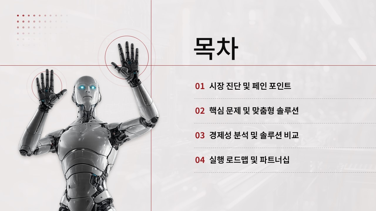 - 시장 분석, 페인 포인트 도출, 경제성 분석, 실행 로드맵의 4개 주요 섹션으로 구성되어 있으며, 각 섹션은 의사결정권자의 관점을 반영하여 설계되었습니다.