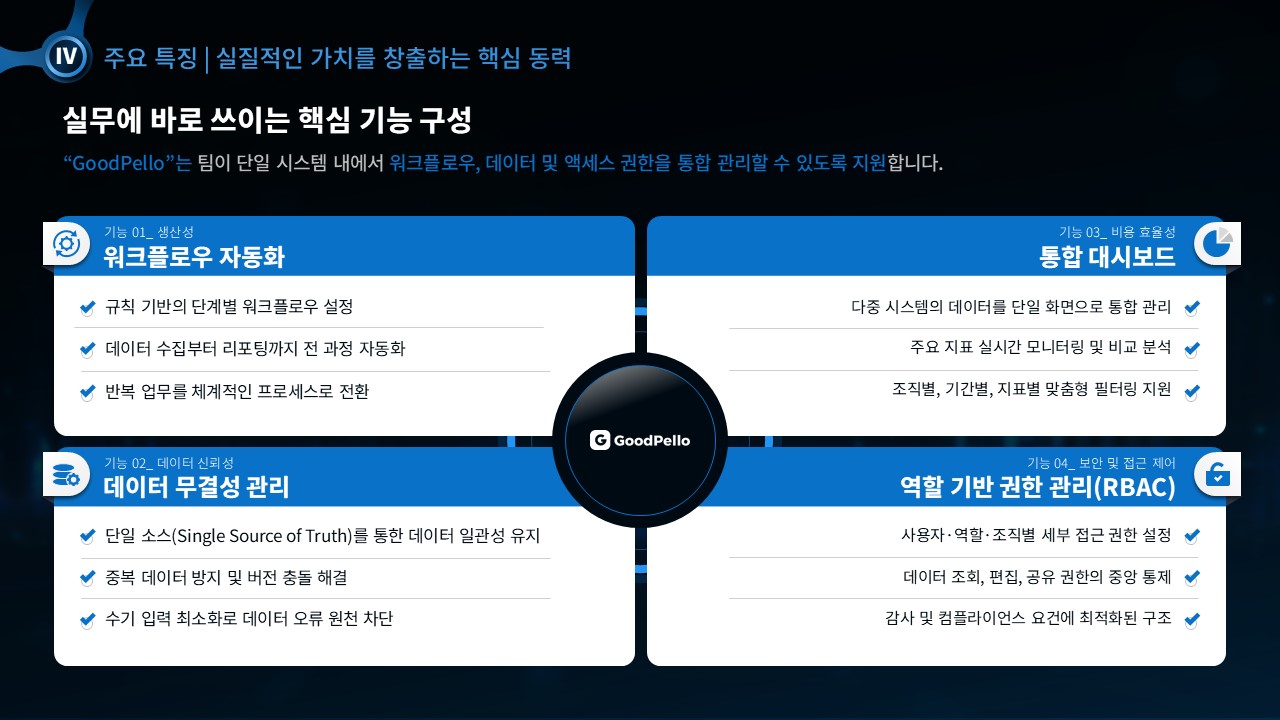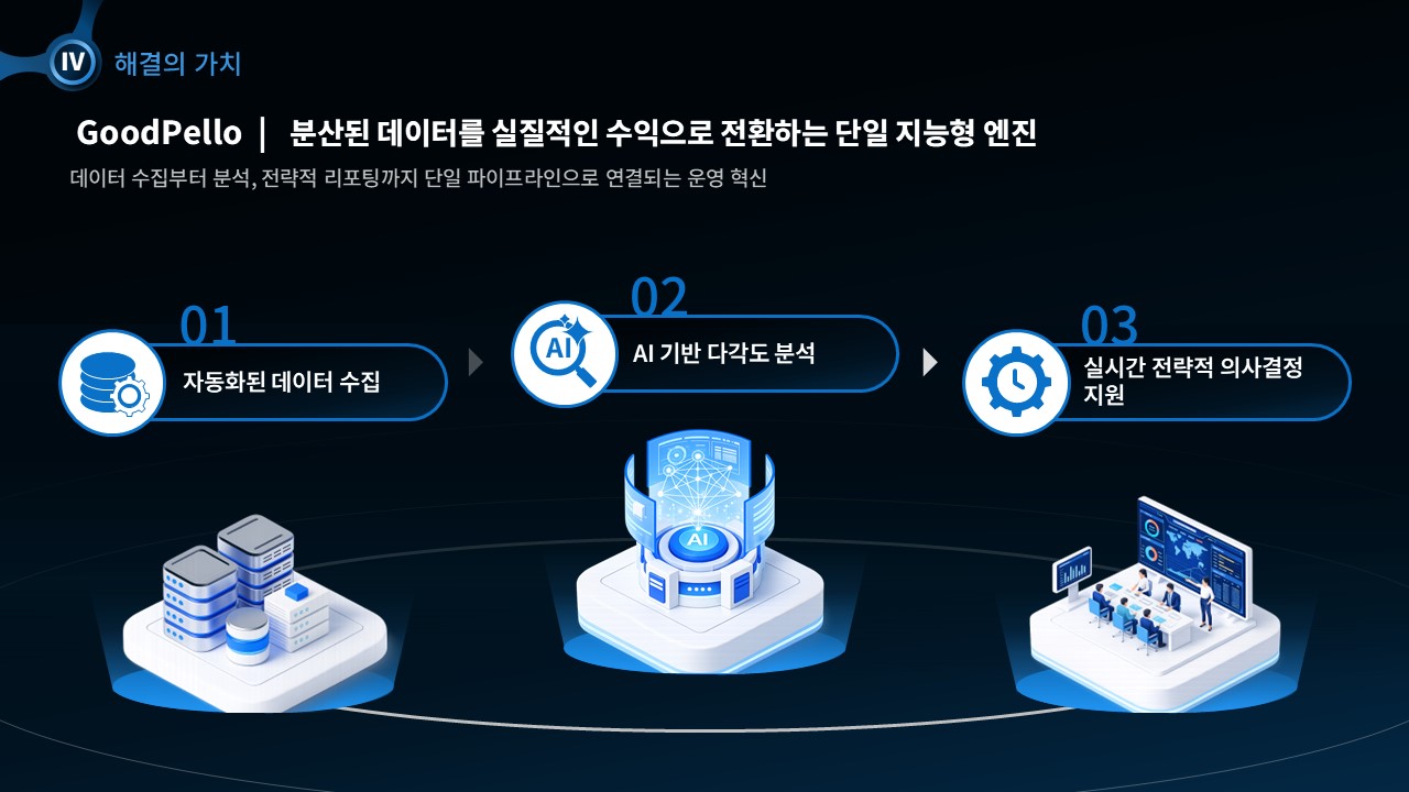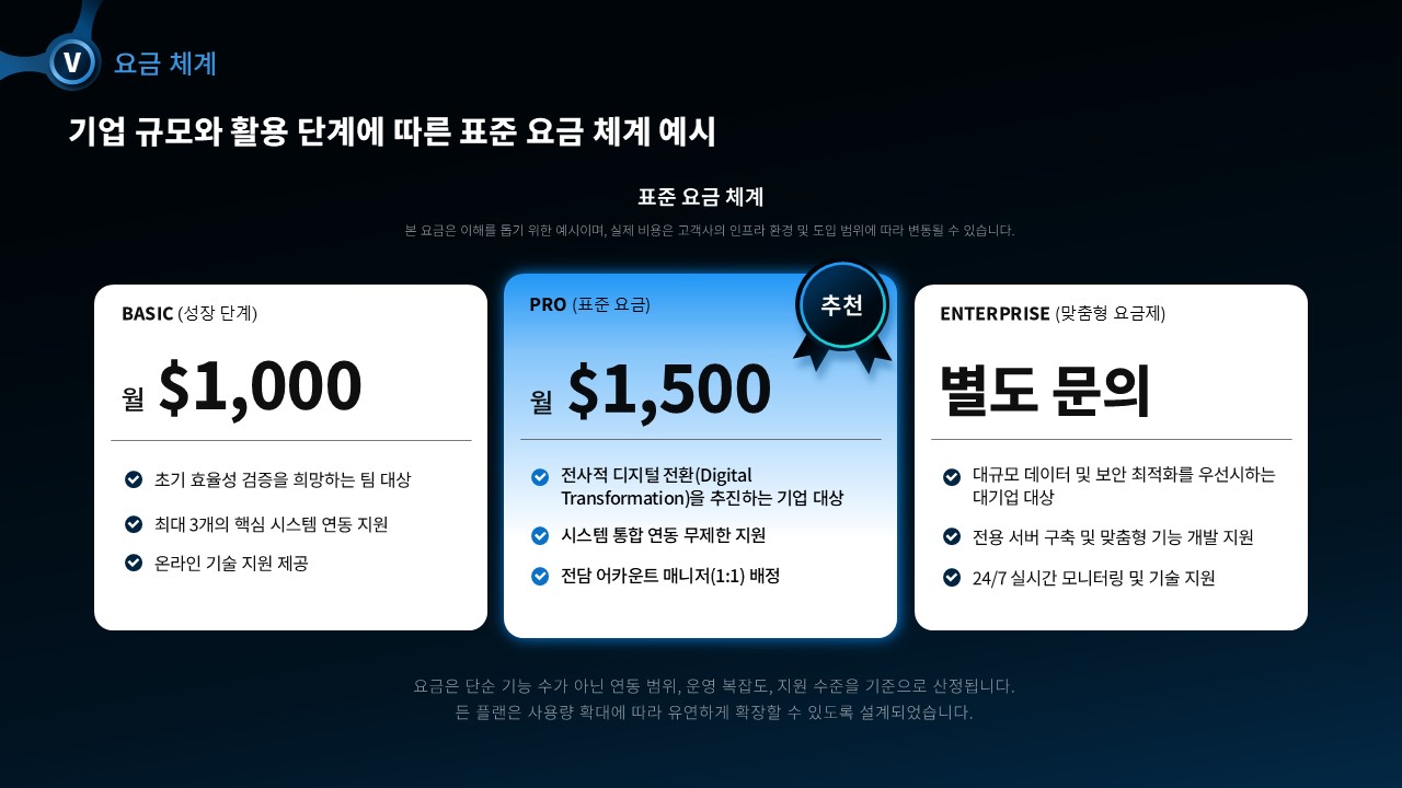 딥네이비·블랙 배경에 블루 포인트를 활용한 프리미엄 다크 B2B 테크 디자인으로 구성된 23페이지 PPT 세일즈덱 템플릿은 문제 정의 / 맥락 및 위기 분석 / 기존 방식의 한계·충돌 / 해결책 / 논리적 근거 / 결과 및 가치 / 다음 단계의 7개 섹션으로 설계되어 있습니다. 3단 비용 카드, AI 파이프라인 플로우, 4단계 기능 그리드, UX 스크린샷, 4단계 도입 타임라인, 요금 체계 카드, 국내·글로벌 성공 사례 비교 표 등 엔터프라이즈 고객사 제안에서 검증된 시각 요소가 모두 포함되어 있으며, 자사 솔루션 데이터와 고객사 정보만 입력하면 임원 대상 B2B 제안서로 즉시 전환됩니다.