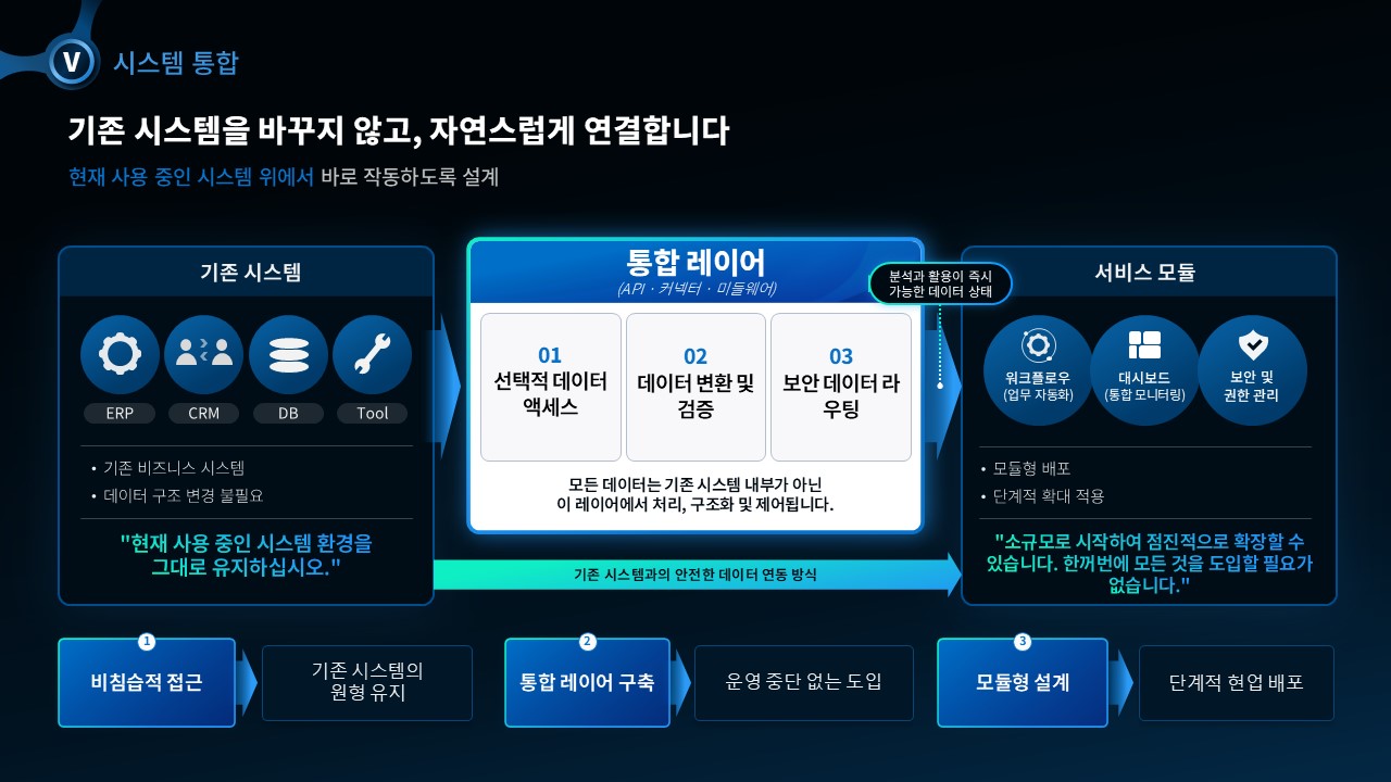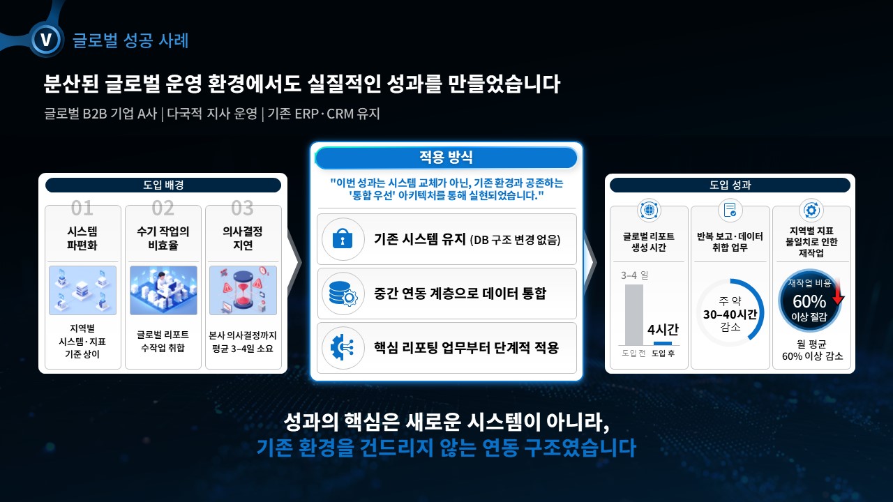 ① B2B SaaS·IT 솔루션 영업팀: 고객사 현황 진단 → 기존 방식 한계 → 솔루션 가치 증명 → 도입 타임라인 → 요금 제안의 전체 세일즈 사이클을 하나의 세일즈덱으로 완성 / ② 사업개발팀: 파트너사·대기업 고객 대상 제안 PT에서 ROI 산출·성공 사례·시스템 통합 아키텍처를 포함한 논리적 근거 섹션을 빠르게 구성 / ③ 스타트업 영업팀: 단순 소개 자료를 고객의 문제 중심 7섹션 B2B 제안서 PPT로 전환하여 고객사 의사결정자 설득력 강화