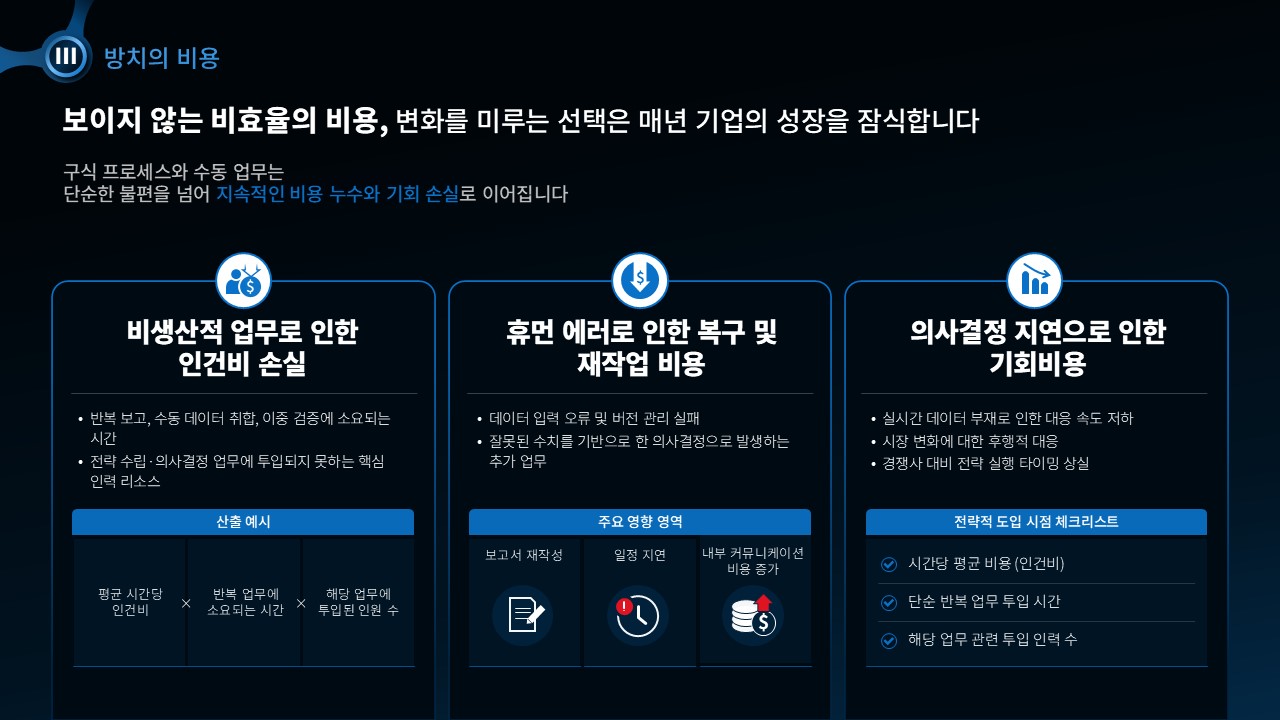 고객이 '도입하지 않을 이유'를 찾기 전에 비용 절감·생산성 향상·리스크 감소의 구체적 수치로 설득이 완료되는 세일즈덱 구조를 확보할 수 있습니다. 지금 PPT 세일즈덱 템플릿을 확인하고 다음 고객사 미팅을 준비하세요.