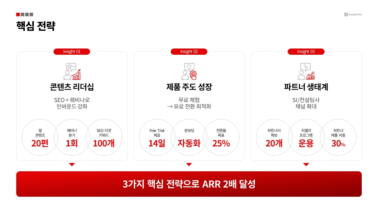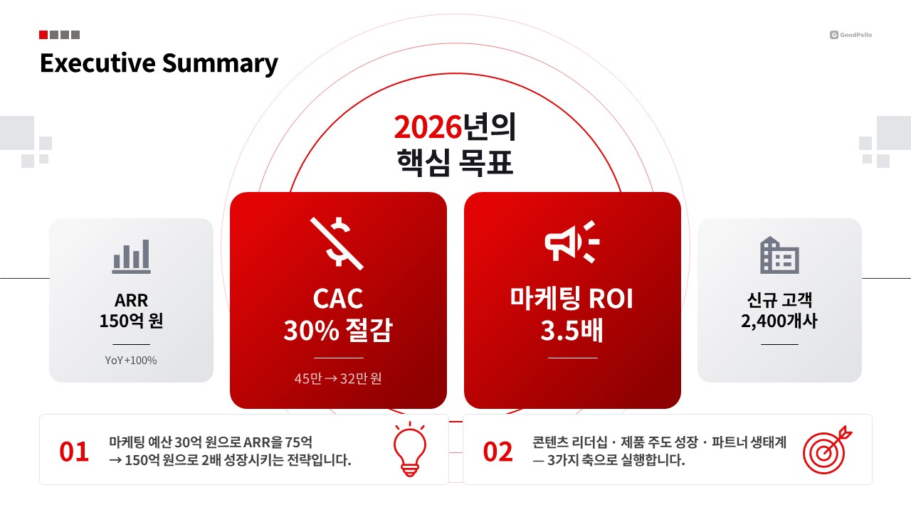 - 이 템플릿은 B2B SaaS 기업의 연간 마케팅 전략을 임원에게 효과적으로 전달하기 위해 설계되었습니다. 임원 보고 시 쉽게 이해할 수 있도록 구성되어 있어 전략적 목표와 성과를 한눈에 제시할 수 있습니다.