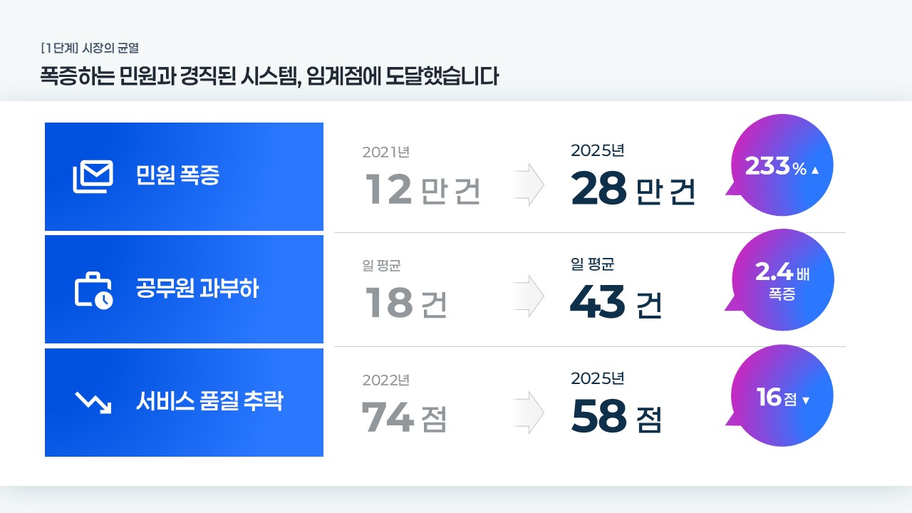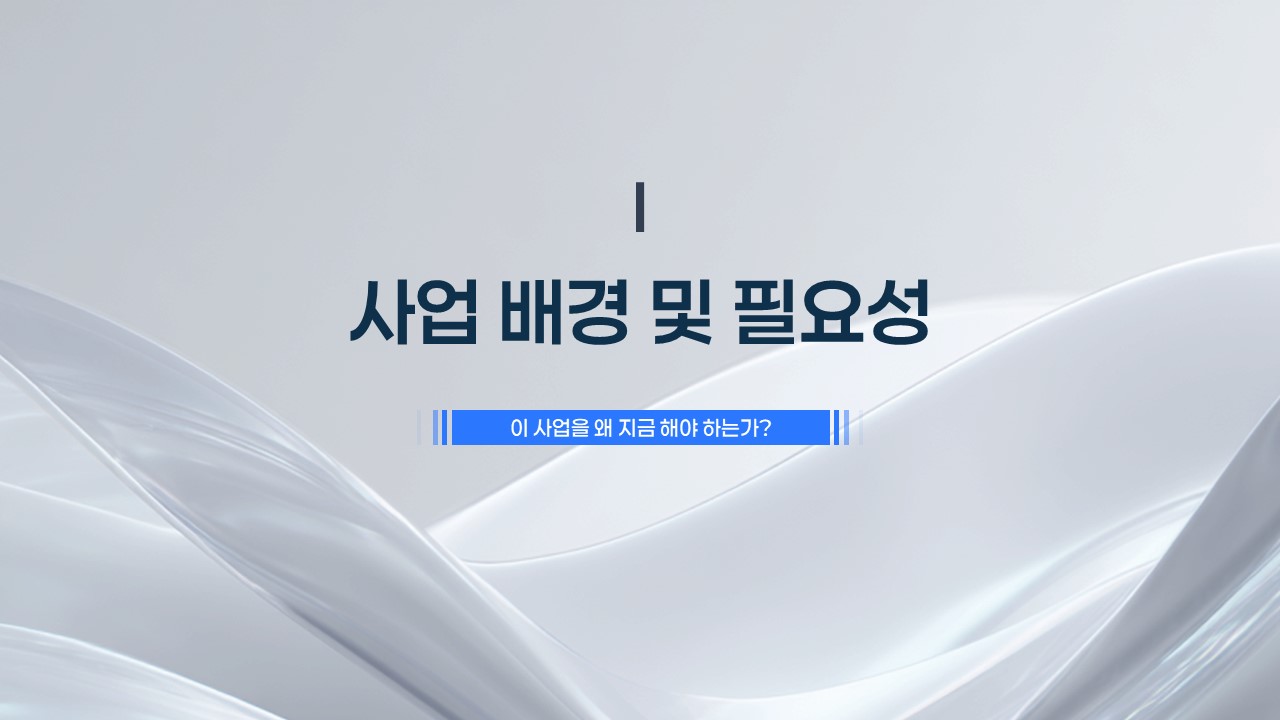 제안서 구조 설계에 소요되던 시간을 대폭 줄이고, 평가위원이 원하는 비즈니스 로직(왜 지금, 왜 이 팀인가)을 각 슬라이드에서 자연스럽게 전달할 수 있습니다. 7단계 전략 모듈과 수치 중심 시각화가 완성된 상태로 제공되므로, 기관명과 수치만 교체하면 입찰 제출 수준의 공공입찰 AI 제안서 PPT를 즉시 완성할 수 있습니다. 지금 바로 확인하세요.