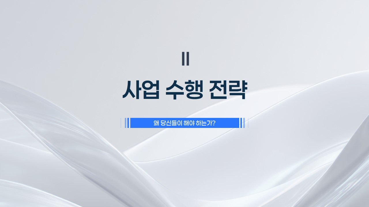 - 전체 슬라이드는 사업 배경, 수행 전략, 실행 계획, 기대 효과 및 리스크 대응 등으로 구성되어 있습니다. 각각의 섹션은 논리적인 흐름을 통해 제안서의 주장을 강화하고, 평가위원이 쉽게 이해할 수 있도록 돕습니다.
