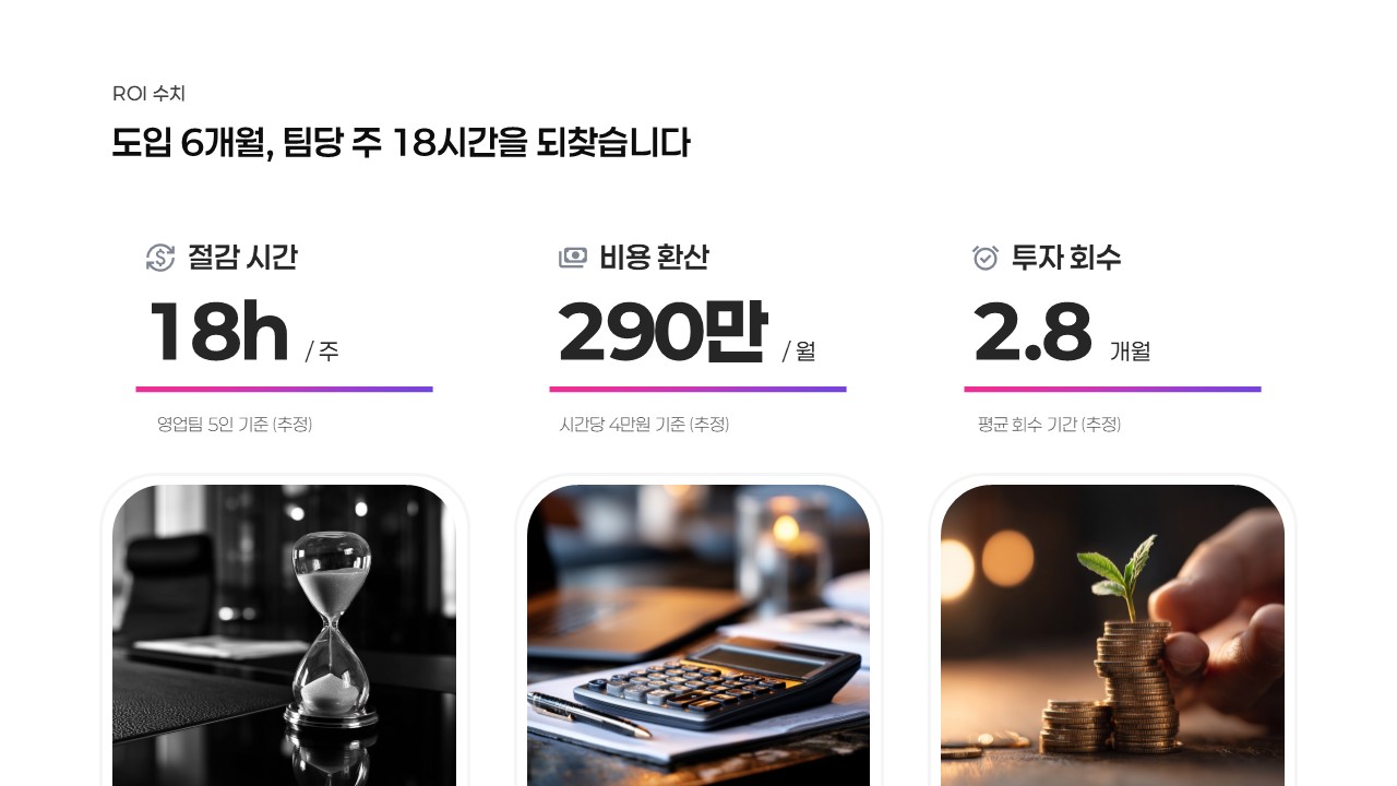영업팀 5인 이상의 B2B SaaS 기업이 고객사 담당자에게 초기 솔루션 소개 미팅을 준비할 때 기본 구조로 활용할 수 있습니다. IT 솔루션·업무 자동화 분야의 사업개발 담당자가 C레벨 또는 구매 결정권자 앞에서 도입 타당성을 발표할 때 ROI 슬라이드와 경쟁 비교 슬라이드를 그대로 사용할 수 있습니다. 기존 소개서의 설득력이 부족하다고 판단한 팀장이 서비스 소개서 프레젠테이션 구조를 재설계할 때 참고 프레임으로도 적합합니다.