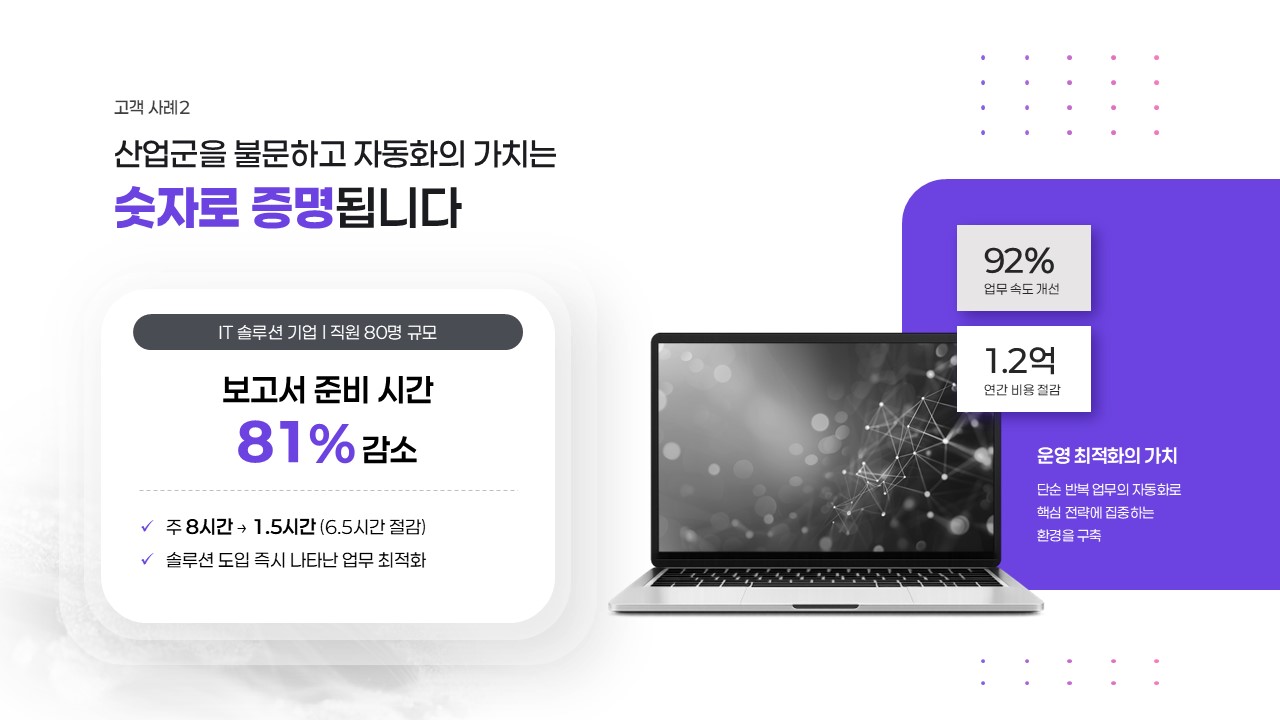- 이 템플릿은 문제 정의와 솔루션 개요를 시작으로, 고객 사례와 ROI 수치, 경쟁 비교까지 이어지는 논리적인 흐름을 갖추고 있습니다.