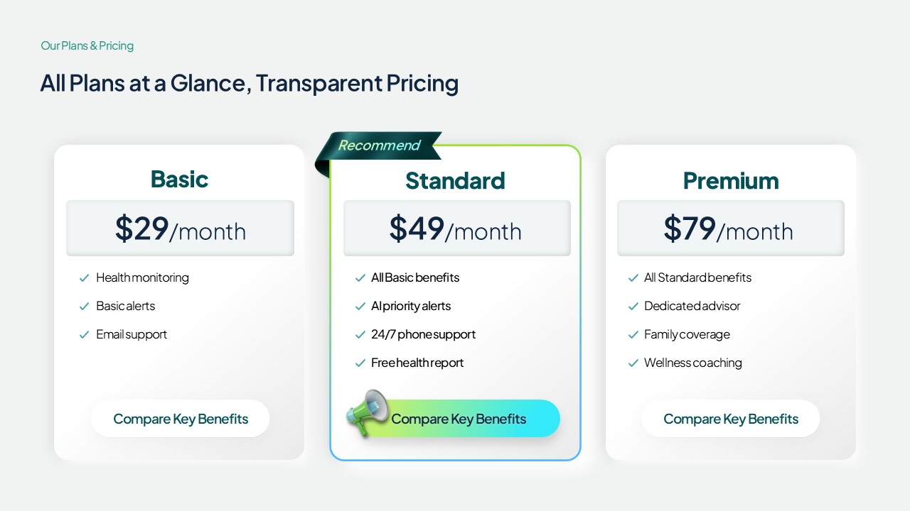 미션·비전·핵심가치 슬라이드, 요금제 비교표(Basic·Standard·Premium), 고객 사례 소개, 스마트헬스 기술 페이지 등 다양한 슬라이드 유형이 포함되어 있어 내용만 교체하면 즉시 활용 가능한 파워포인트 양식입니다.