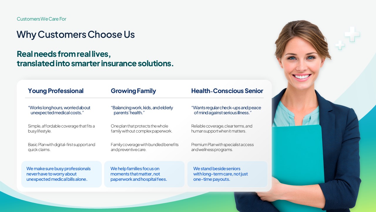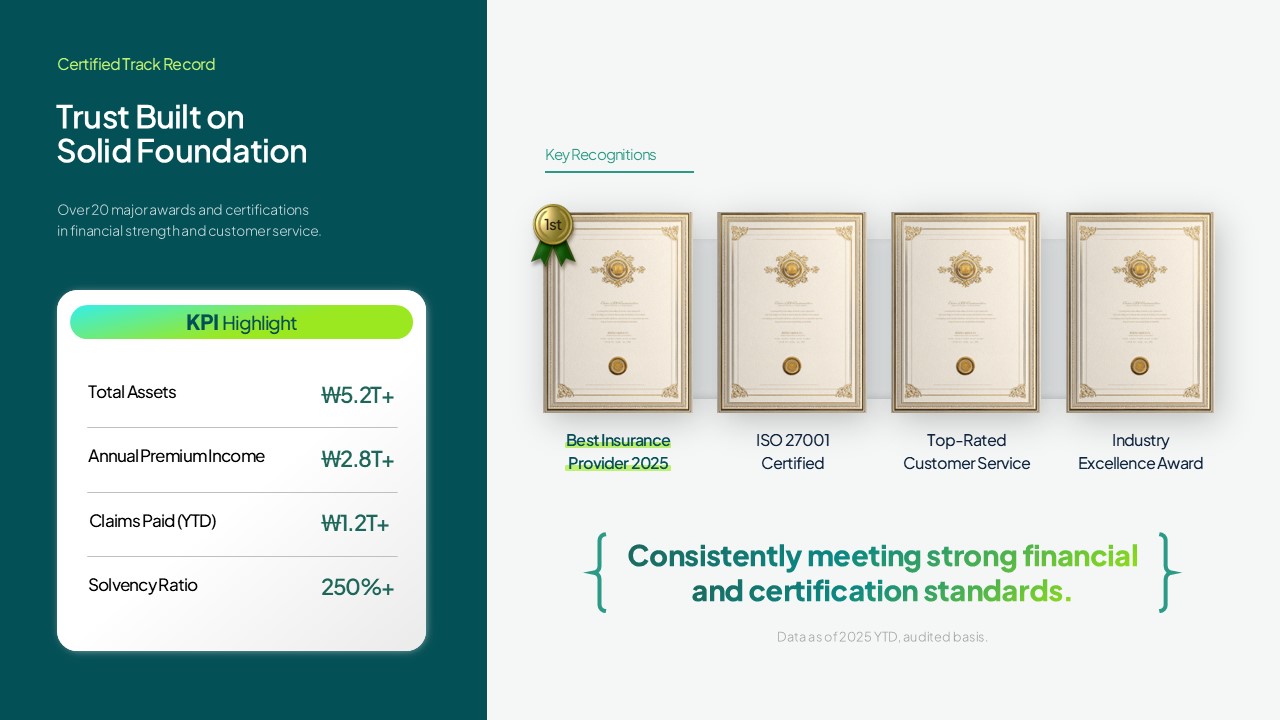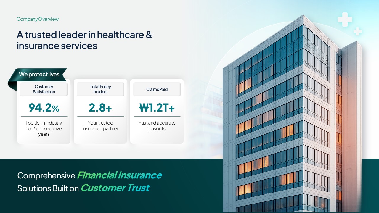 보험사, 헬스케어 스타트업, 병원, 핀테크 기업 등 신뢰와 전문성을 강조해야 하는 기업에 적합합니다. 투자 유치, 파트너십 제안, 신규 서비스 론칭 발표 등 다양한 비즈니스 상황에 활용 가능한 범용 PPT 양식입니다.