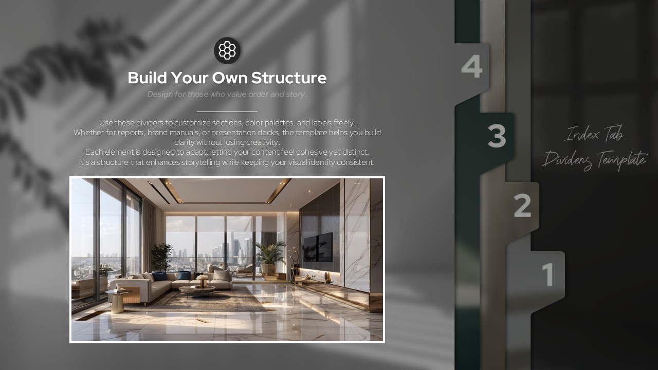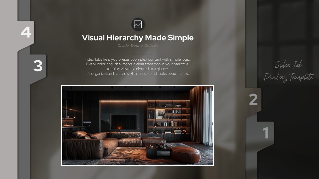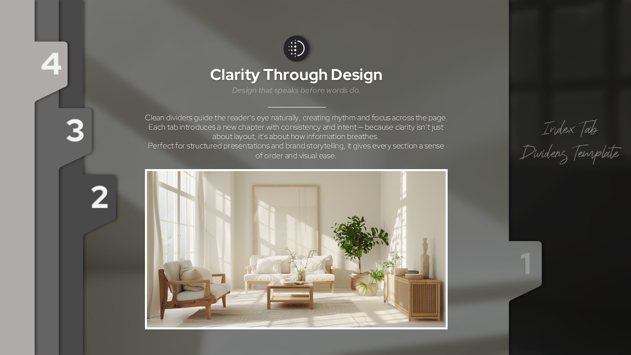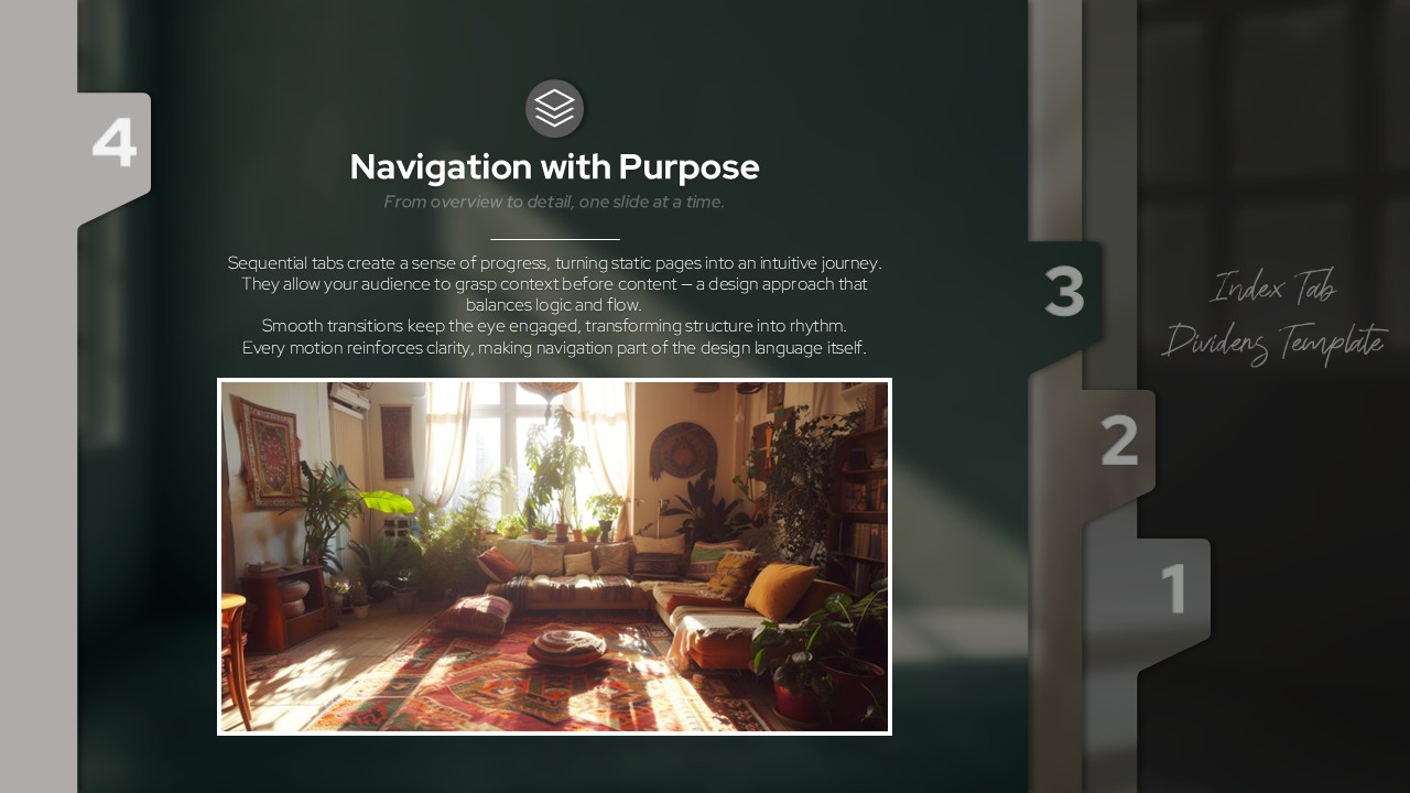 슬라이드 전환마다 번호형 인덱스 탭이 모핑 효과로 화면 좌우를 이동하며 발표 흐름을 자연스럽게 안내하는 무빙 파워포인트 템플릿입니다. 일반 프레젠테이션과 달리 탭 번호(1~4)가 슬라이드 전환 시 실제로 위치를 이동하는 모션 효과가 청중의 시선을 집중시키고 섹션 흐름을 직관적으로 전달합니다. 차콜 그레이와 다크 그린 배경 또한 모핑으로 전환되어 배경·아이콘·이미지가 하나의 자연스러운 흐름 속에서 움직입니다. 표지의 손글씨 스크립트 폰트와 각 섹션별 라인형 아이콘, 인테리어 포토 레이아웃이 어우러져 프리미엄 분위기를 완성합니다. PPTX 포맷으로 모핑 효과가 그대로 포함되어 즉시 활용 가능하며, 브랜드 런칭·고급 세미나·임원 보고 등 강한 인상이 필요한 모든 발표 상황에 적합한 PPT 슬라이드 세트입니다.