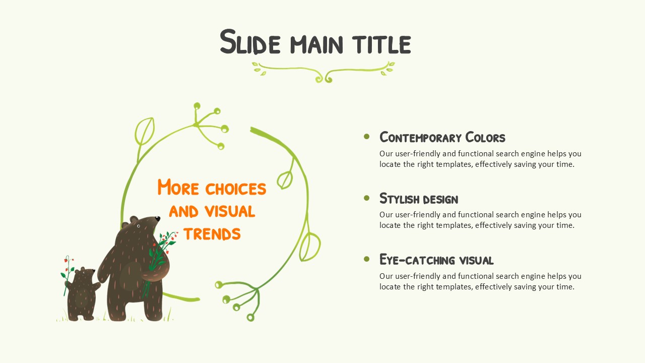 이 템플릿은 재미있고 친근한 동물 일러스트로 꾸며져 있어 교육용 프레젠테이션에 적합합니다. 특히 유치원, 어린이 교육, 생태 교육 자료와 같은 다양한 문서 유형에서 활용할 수 있으며, 창의력과 재미를 더해 발표 준비를 도와줍니다. 주황색과 초록색을 기반으로 한 화사한 색상 조합은 시각적으로 매력적이며, 교육내용의 전달을 더욱 효과적으로 만들어 줍니다. 어린이 교육자 및 부모님들에게 추천드립니다.