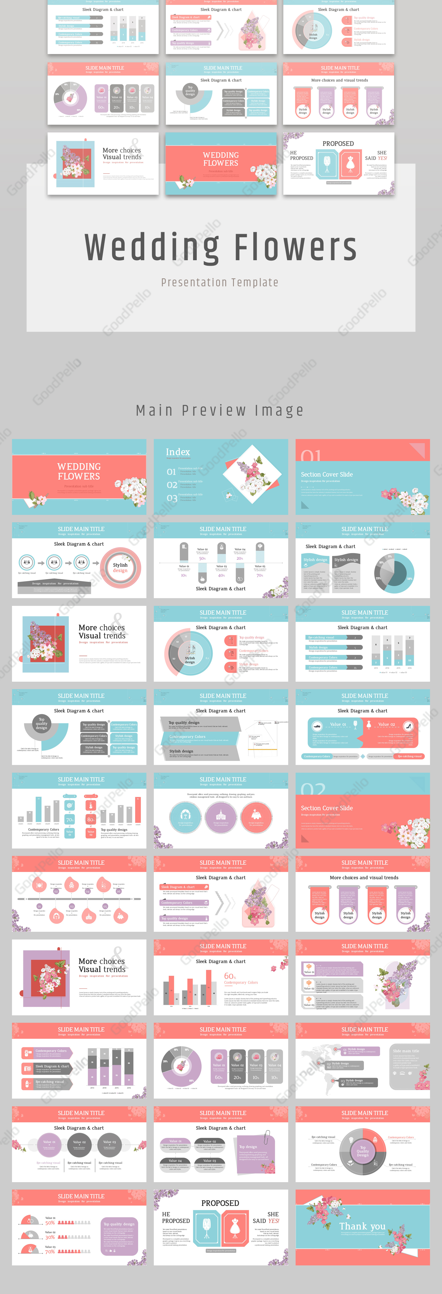 This ‘Wedding Flowers Presentation’ is designed based on a theme related to wedding flowers. Using illustration images related to wedding, it gives bright and beautiful images overall. In addition, pink and sky blue colors are used as point colors adding more gorgeous looks overall. The graphs and diagrams are designed simple and easy so that even beginners can easily modify within the PowerPoint.