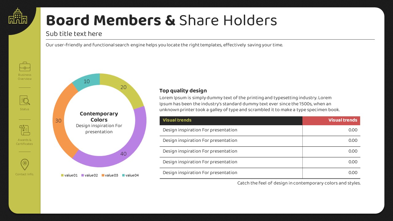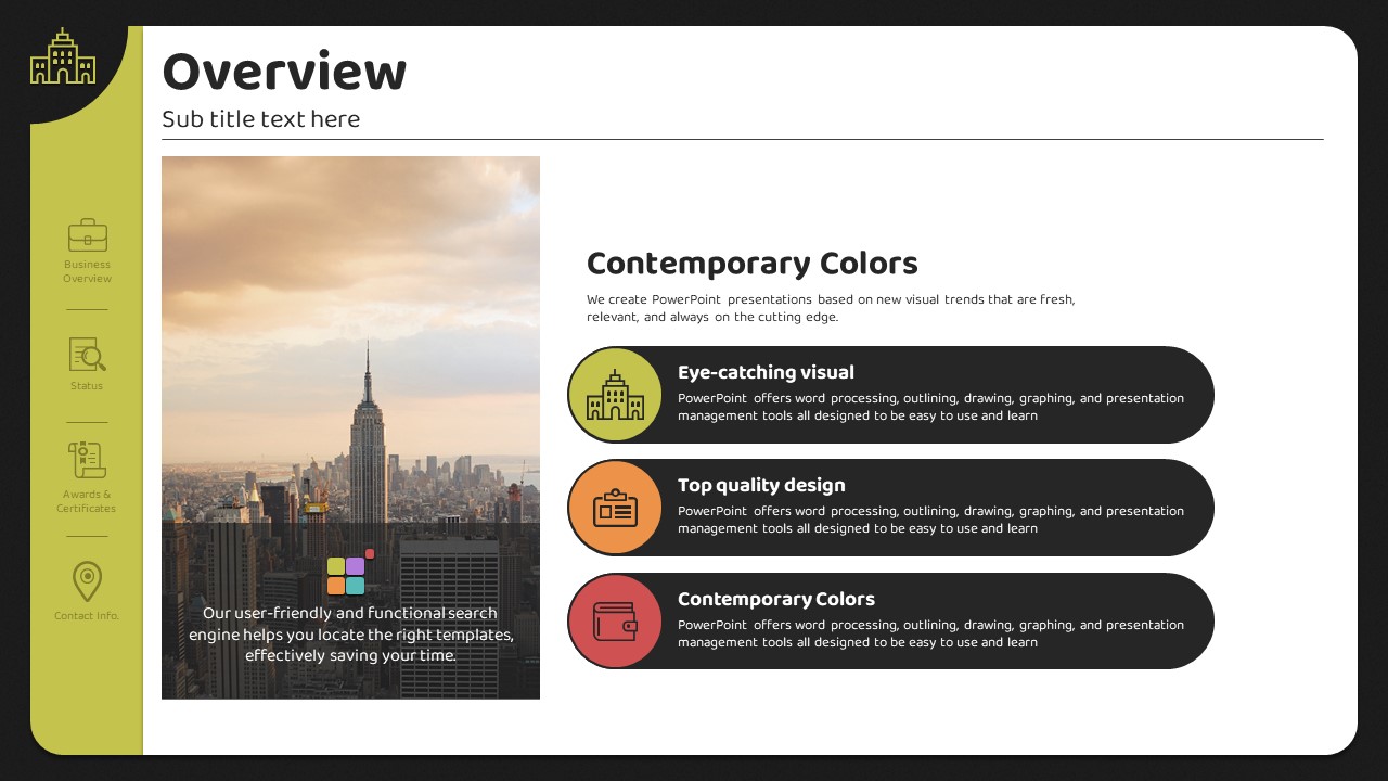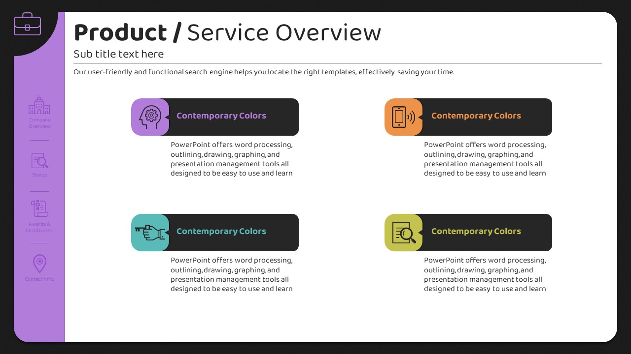 이 템플릿은 현대적이고 세련된 컬러 테마를 적용하여 회사 소개, 비즈니스 전략, 제품/서비스 개요 등을 효과적으로 전달할 수 있도록 설계되었습니다. 26장의 슬라이드로 구성되어 있으며, 각 슬라이드는 명확한_font_구성이 특징입니다. 초록, 주황, 보라의 조화로운 색상이 정보의 시각적 전달을 돕고, 수신자에게 긍정적인 인상을 남길 수 있도록 돕습니다. 기업 실무자, 마케터, 기획자 등 다양한 분야의 사용자에게 적합하며, 신뢰성 있는 발표 자료 작성과 효과적인 커뮤니케이션을 지원합니다.