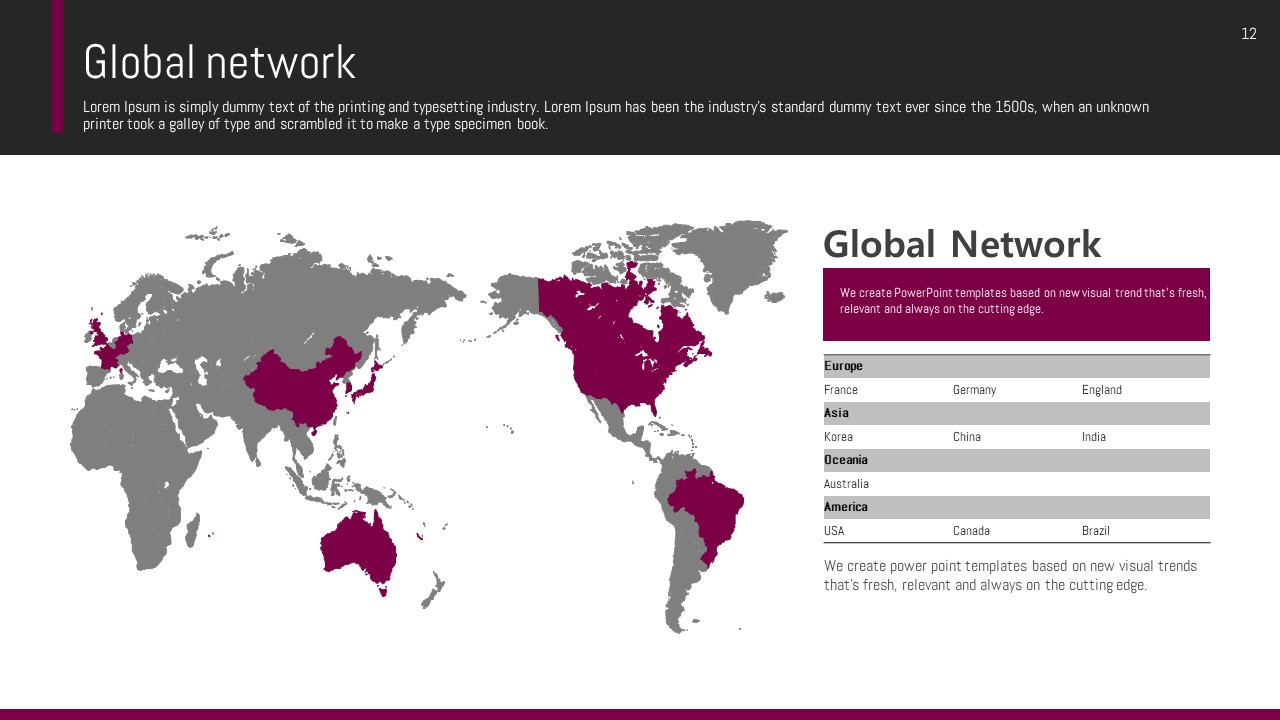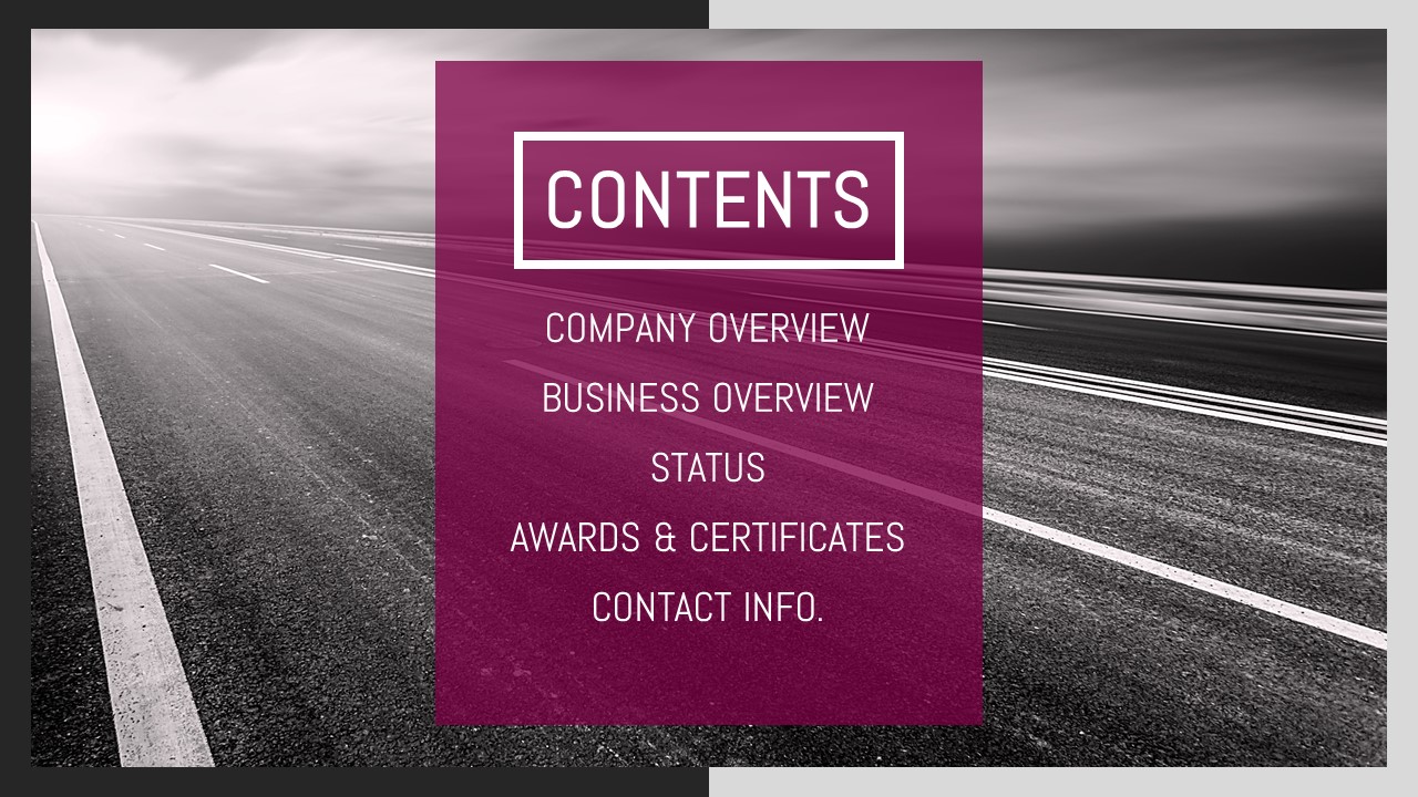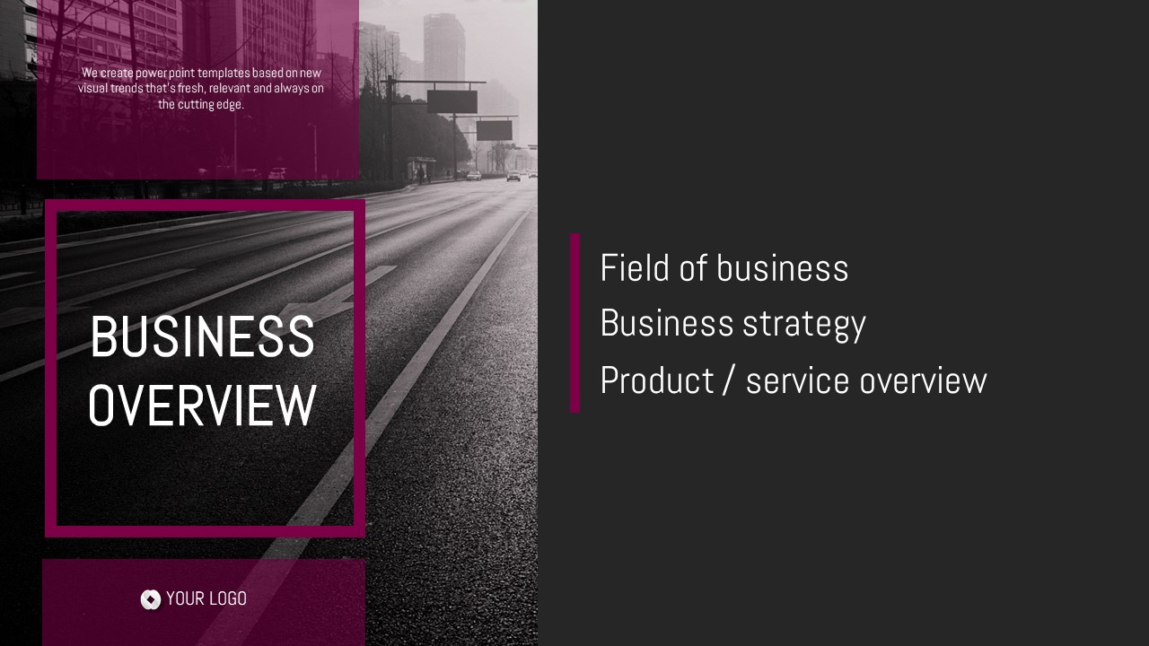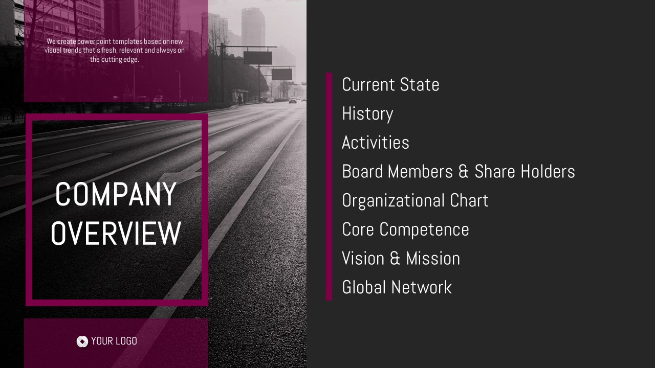 이 로드 회사소개서 템플릿은 전문적이고 세련된 디자인으로, 26장의 슬라이드로 구성되어 있습니다. 정보의 흐름은 회사 개요, 비전 및 미션, 글로벌 네트워크, 비즈니스 개요 등으로 이어져 청중에게 효과적으로 정보를 전달합니다. 보라색의 메인 컬러와 심플한 레이아웃은 시각적으로 매력적이며, 귀사의 브랜드 이미지를 잘 반영할 수 있습니다. 기업 실무자와 마케팅 팀에게 추천합니다.