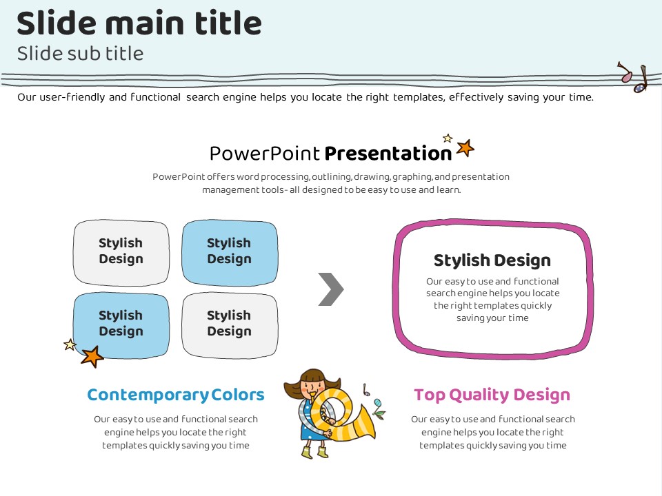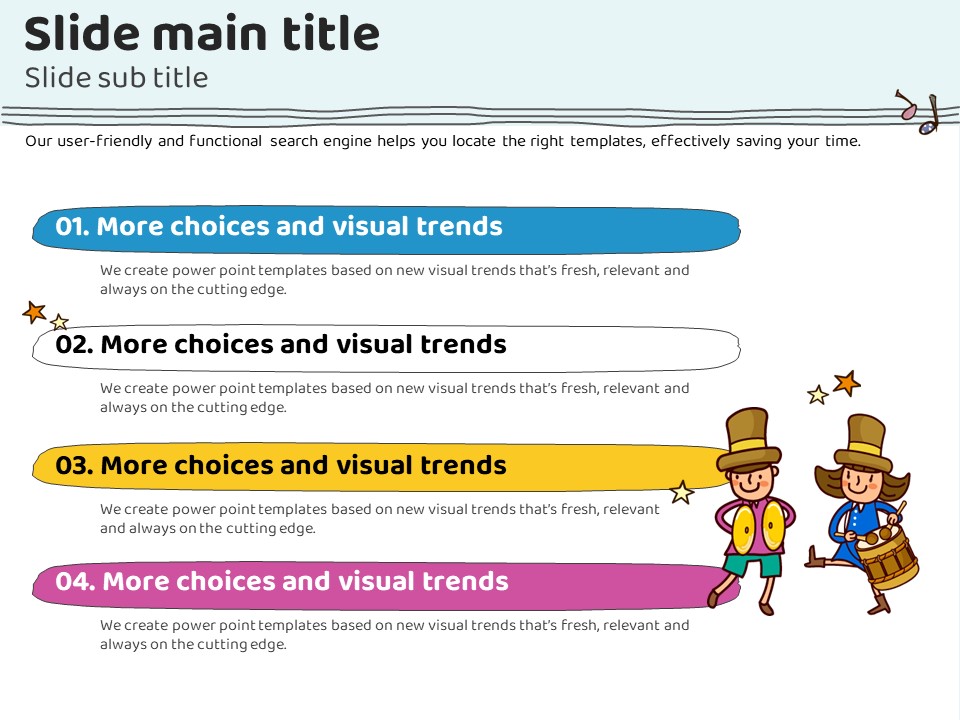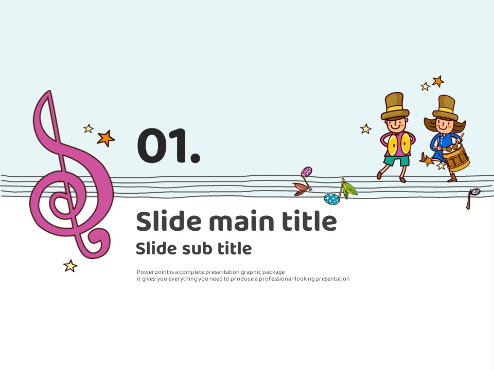 이 템플릿은 어린이를 위한 음악 발표와 관련된 다양한 교육 상황에 적합한 디자인으로 구성되어 있습니다. 선명한 보라, 파랑, 노랑색상과 귀여운 그래픽 요소들이 담겨 있어 강의자료, 음악 수업, 합주 발표 등 여러 교육적 문서 유형에 활용될 수 있습니다. 특유의 유쾌한 느낌은 학생들의 흥미를 이끌어내며, 어린이 교육에 적합한 완벽한 선택이 될 것입니다.