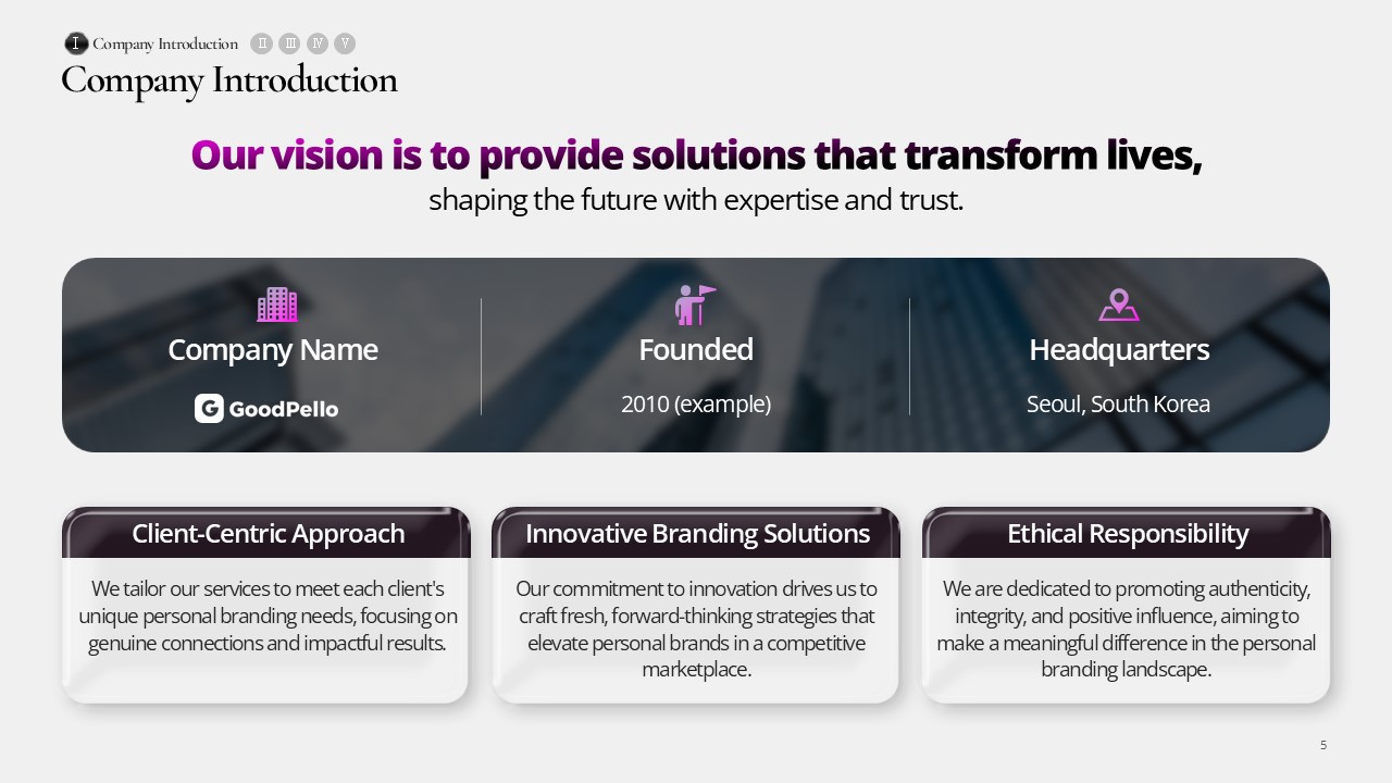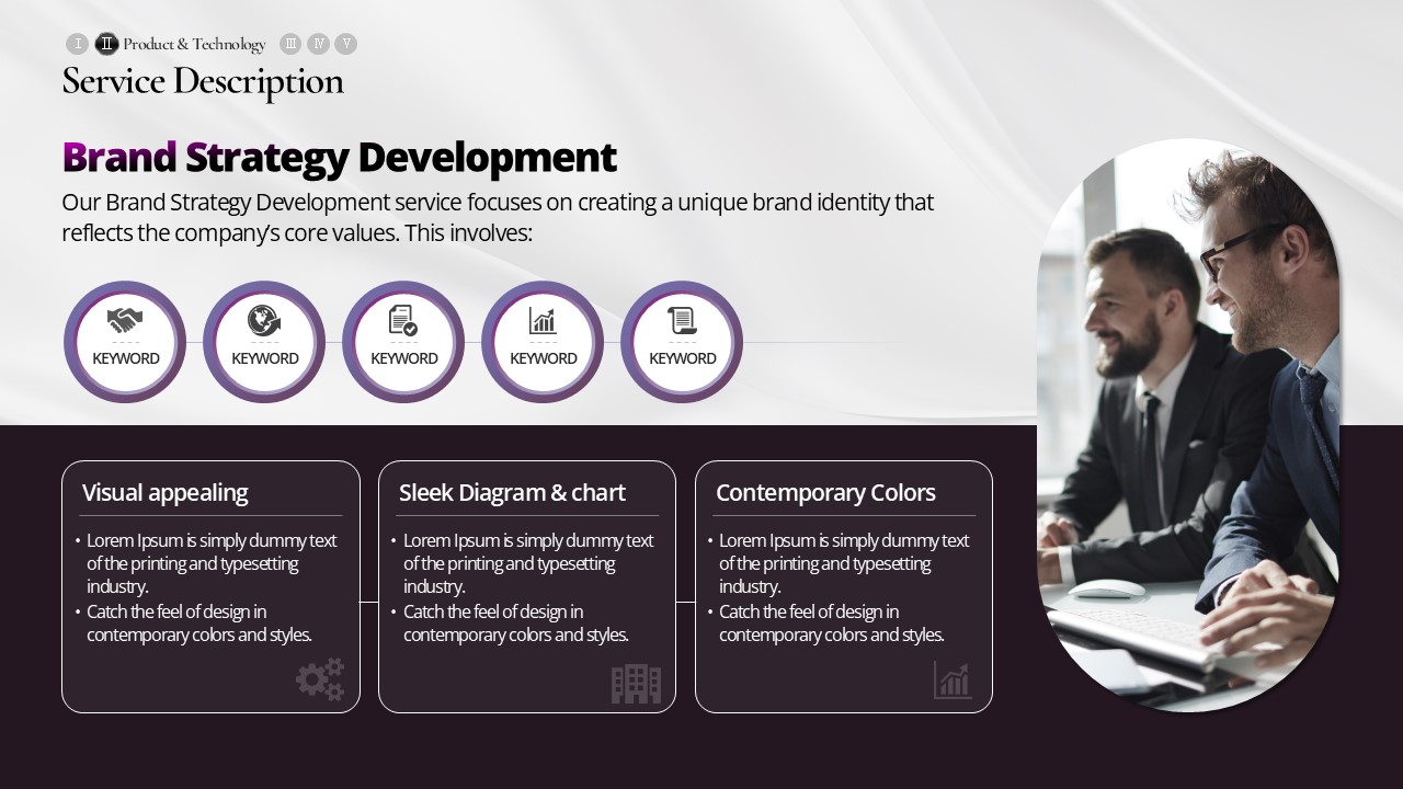 이 템플릿은 현대적이고 세련된 디자인을 통해 개인 브랜드를 효과적으로 소개하는 데 최적화된 구성으로, 21장 슬라이드로 제품의 특징과 강점을 매력적으로 전달합니다. 특히, 보라색과 회색의 조화로운 색상은 전문적인 이미지를 부각시켜 사용자가 자신의 서비스를 돋보이게 할 수 있도록 돕습니다. 특히 서비스 발표, 컨설팅 세션, 마케팅 프레젠테이션 등 다양한 상황에서 활용할 수 있어 크리에이티브 전문가 및 기업 실무자에게 추천합니다.