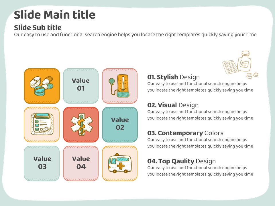 이 템플릿은 의료, 약학, 연구 등의 분야에서 효과적으로 활용할 수 있도록 설계되었습니다. 세련되고 직관적인 디자인을 통해 의료 정보를 명확하게 전달하며, 다양한 종류의 발표 자료에 적합합니다. 이 템플릿은 특히 병원 내부 보고서, 연구 발표, 의학적 제안서와 같은 문서에 적합합니다. 교육자, 의료 전문가 및 연구자에게 추천드립니다.
