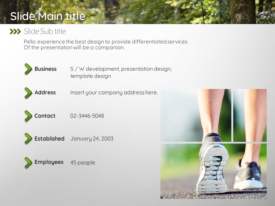이 템플릿은 건강과 운동을 주제로 한 발표를 위해 설계된 세트형 구성으로, 생동감 있는 이미지와 깔끔한 레이아웃이 특징입니다. 스포츠 관련 데이터 분석, 건강 관리 프로그램 소개, 피트니스 마케팅 자료 등 다양한 문서 유형에 적합합니다. 개인 트레이너, 운동 분야 종사자, 건강 관련 발표를 준비하는 전문가에게 이상적입니다.