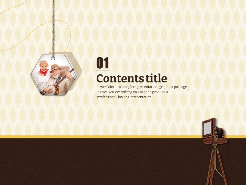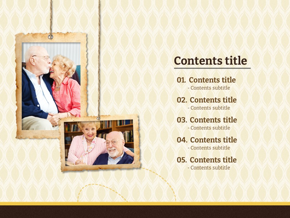 이 PPT 템플릿은 노부부의 사랑과 행복한 순간들을 담아낸 디자인으로, 가족 발표, 노인복지 관련 자료, 또는 개인 프로젝트에 활용하기 적합합니다. 따뜻한 갈색 톤과 부드러운 이미지 레이아웃은 실질적인 정보를 전달하면서도 감성적인 분위기를 유지할 수 있습니다. 가족이나 노인 관련 서비스 제공자에게 특히 추천드립니다.