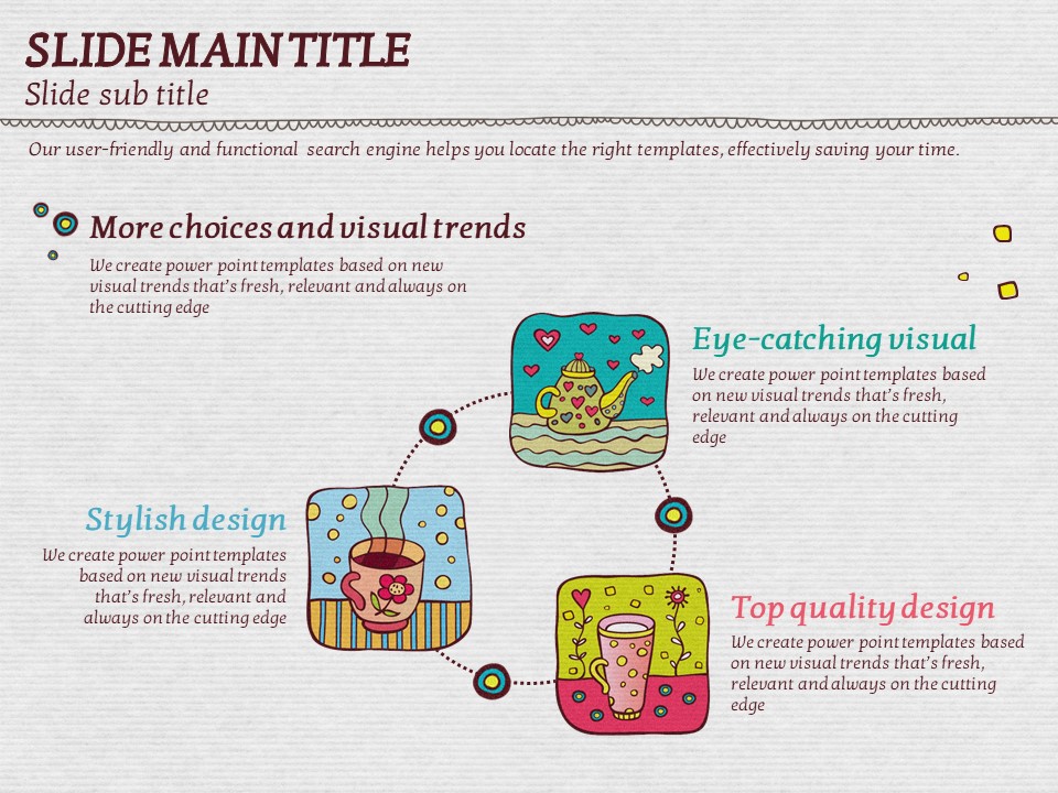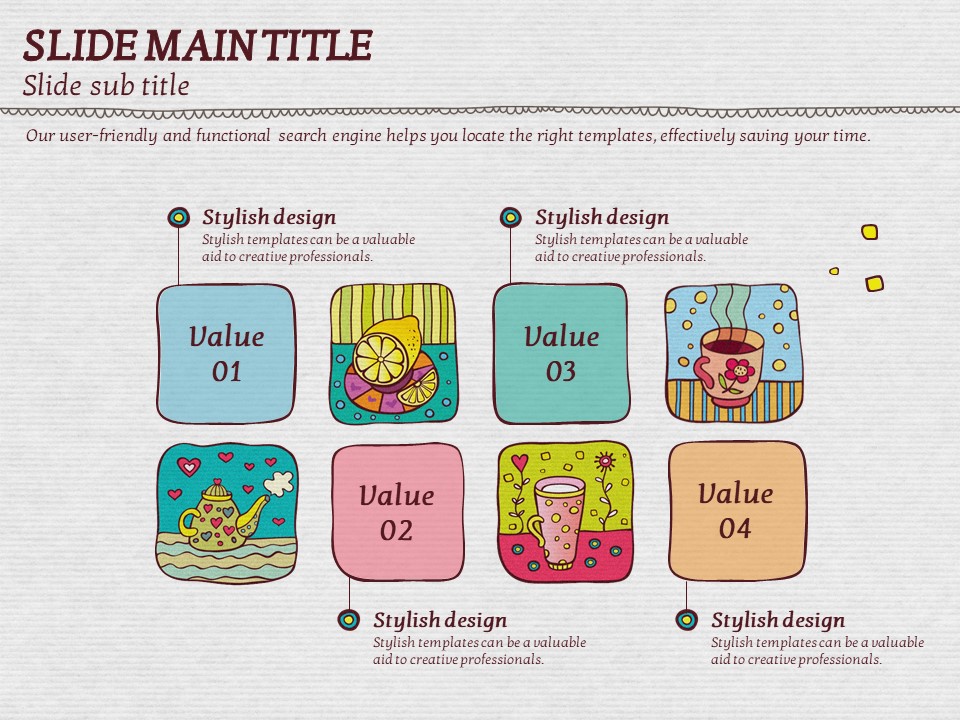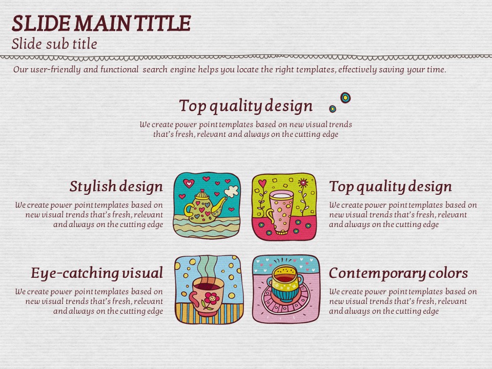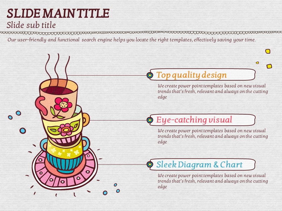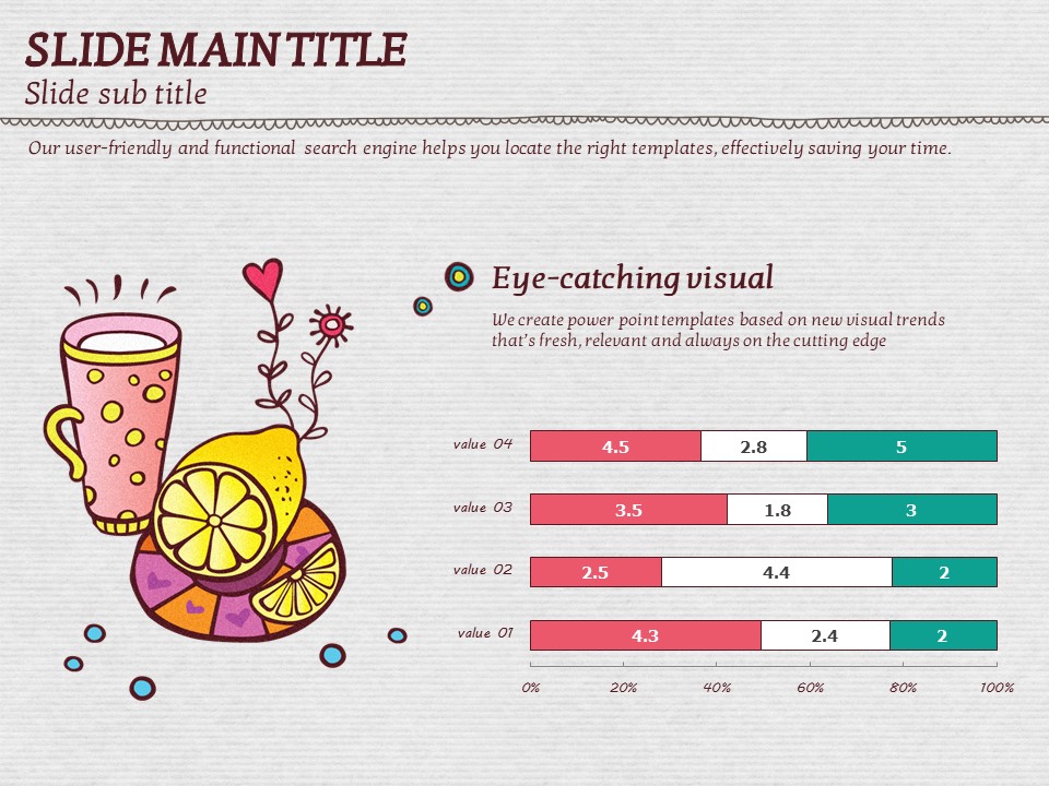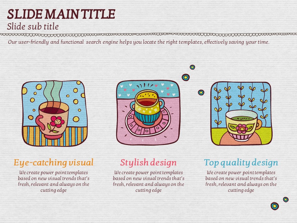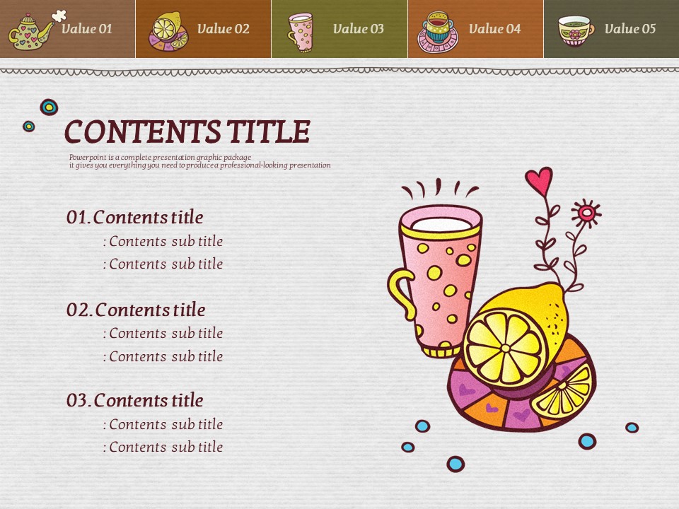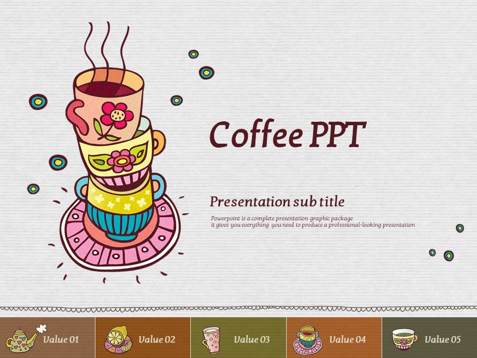 이 템플릿은 색감이 풍부하고 아기자기한 일러스트 커피잔 디자인으로, 카페 관련 기획서, 이벤트 발표, 마케팅 자료에 적합합니다. 시각적으로 매력적인 슬라이드 구성은 창의적이고 감성적인 프레젠테이션을 위한 최적의 선택입니다. 바리스타, 카페 창업자, 디자인 전문가들에게 특히 추천드립니다.