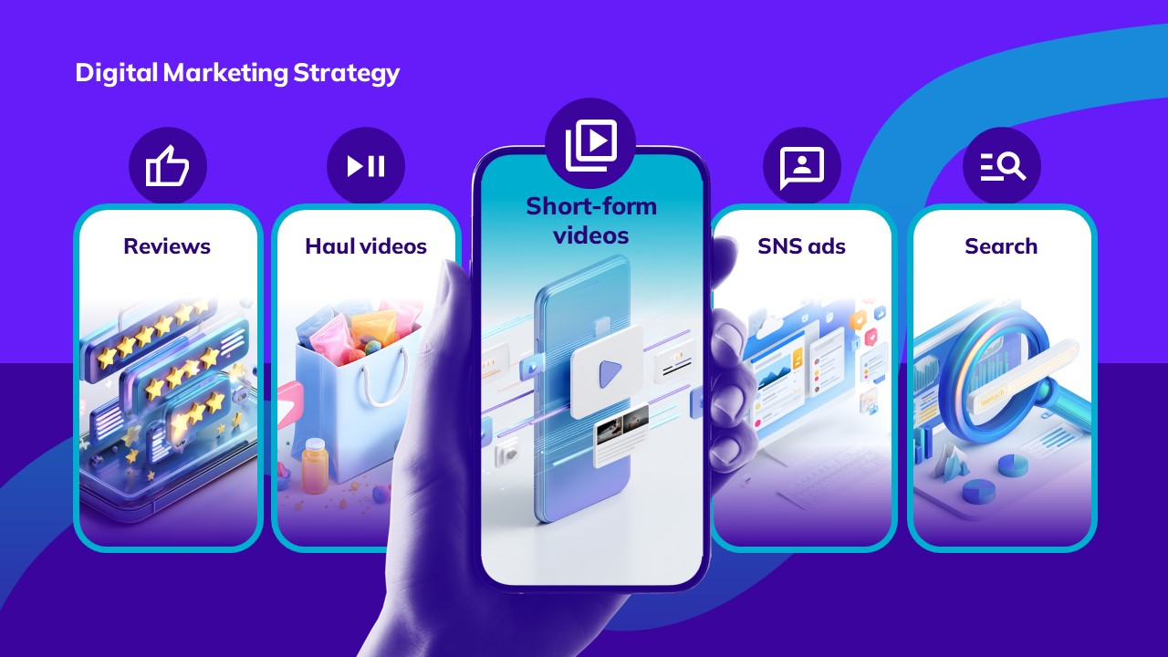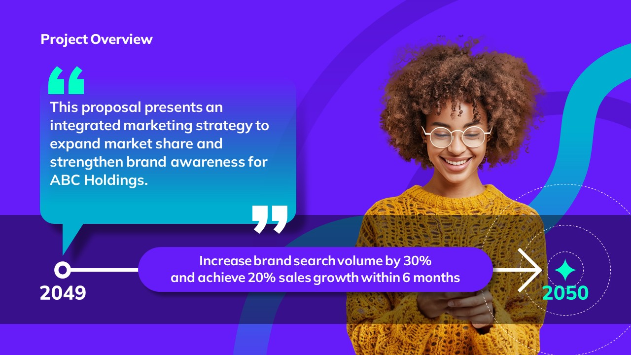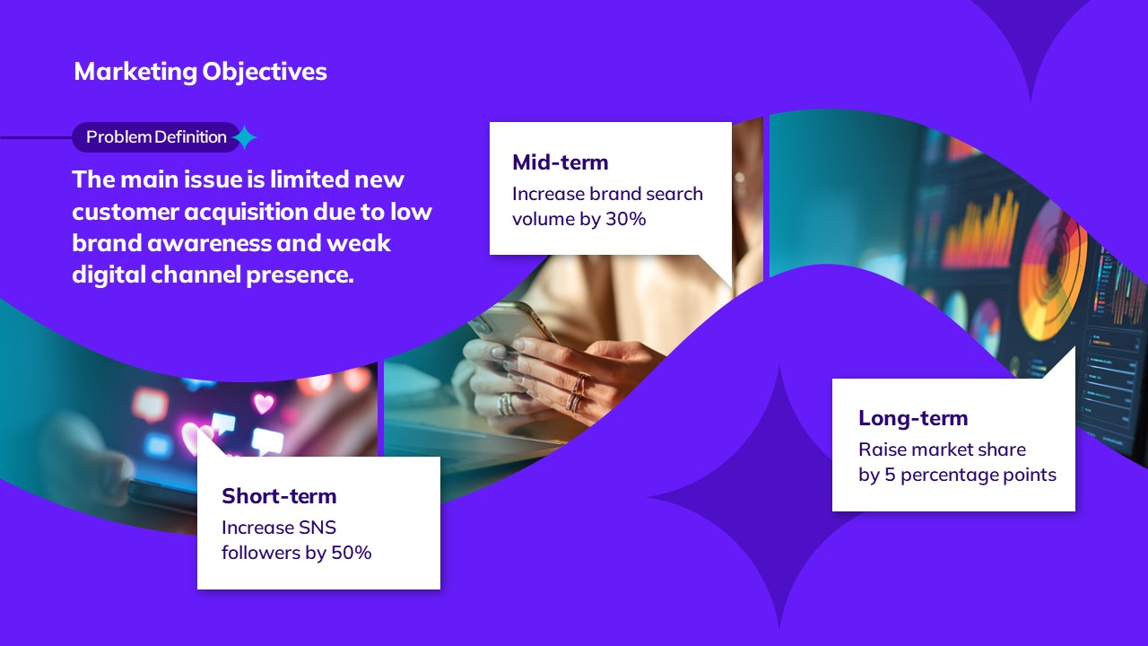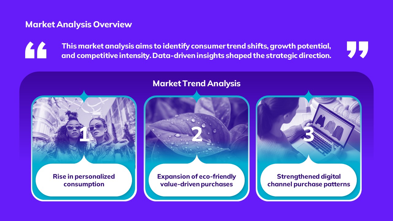 감각적인 퍼플 톤과 유연한 곡선 레이아웃이 돋보이는 마케팅 기획서용 템플릿입니다.