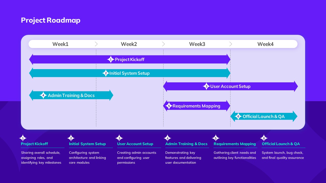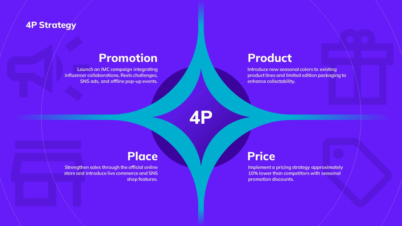 프로젝트 개요, 시장분석, 경쟁사 전략, 4P 구성, 디지털 캠페인 로드맵 등 마케팅 프로세스 전반을 시각적으로 명확히 표현할 수 있습니다.
