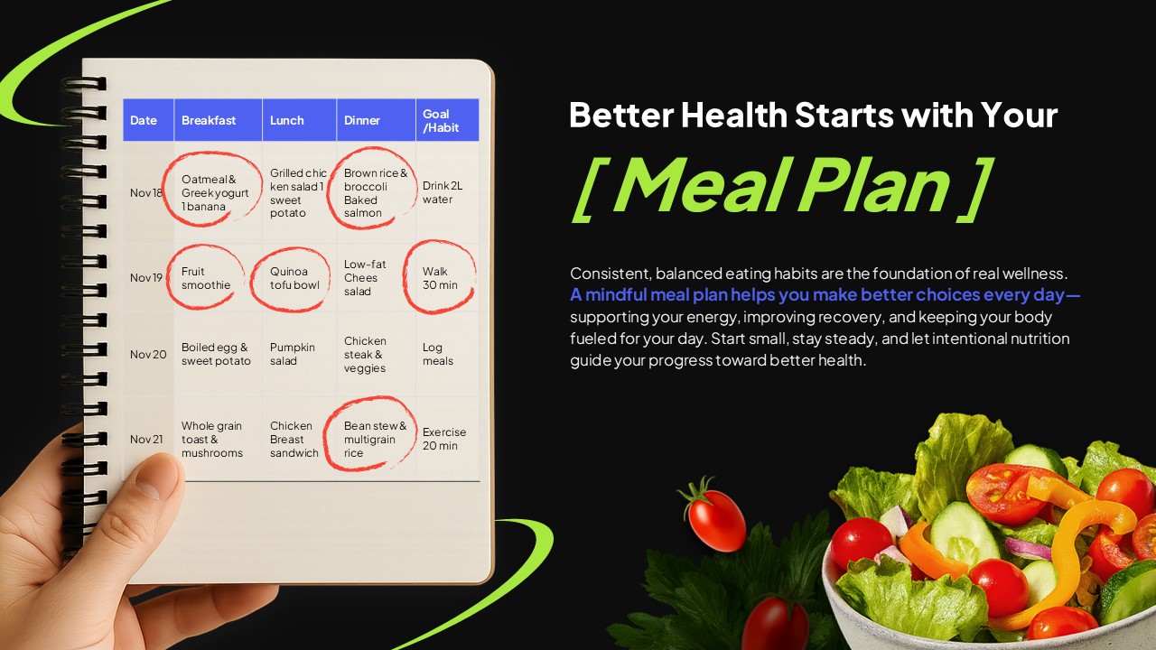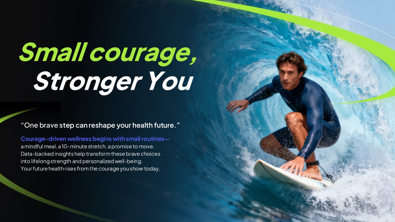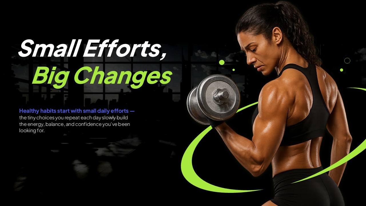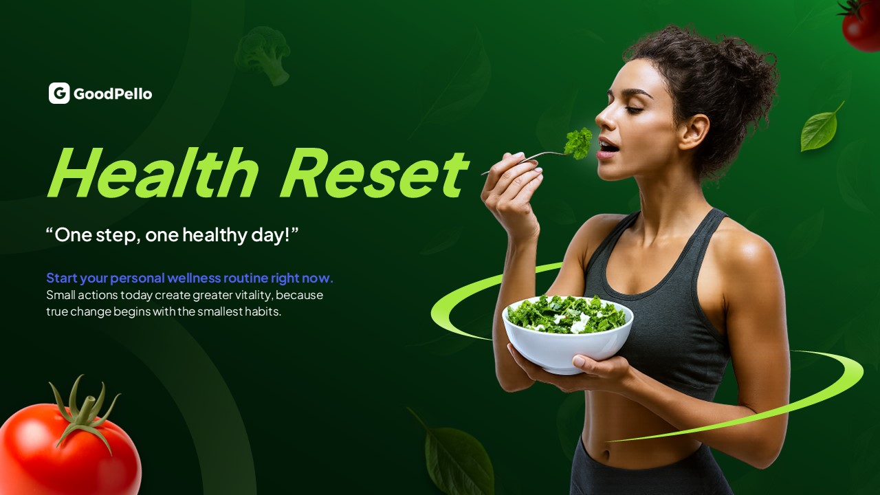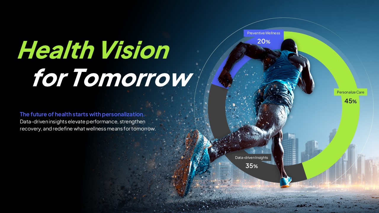 각각의 슬라이드는 건강 리셋, 작은 도전, 미래의 건강 비전, 꾸준한 노력, 식단 플랜, 휴식의 힘 등 다양한 테마를 감각적으로 담아냅니다.