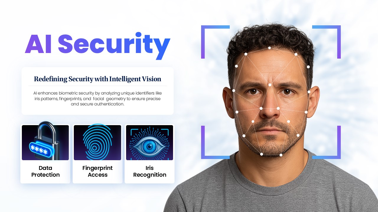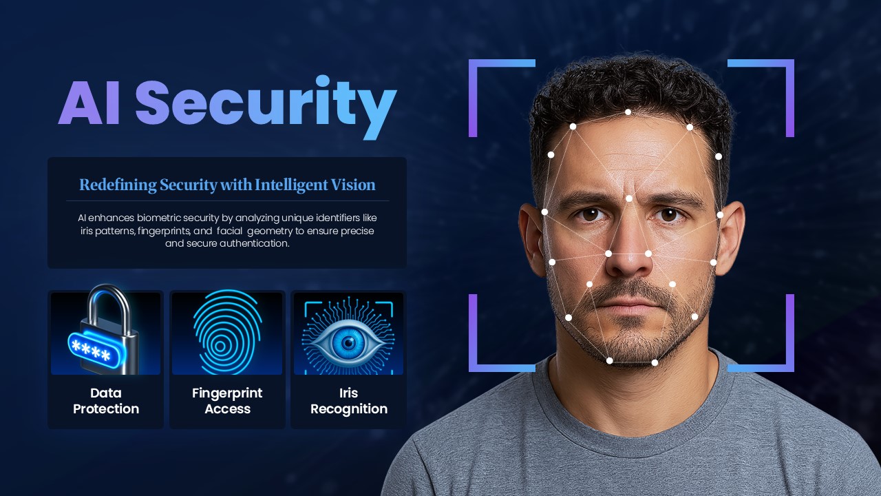 인공지능 보안 기술을 강조한 슬라이드로, 얼굴 인식과 디지털 보안 시스템을 시각적으로 표현했습니다. 생체 인증, 데이터 보호, 사이버 보안 솔루션을 설명하는 프레젠테이션에 적합하며, AI 기반 보안의 중요성과 신뢰성을 전달합니다. IT 보안 세미나, 기업 IR 발표, 기술 제안서에 활용하기 좋습니다.