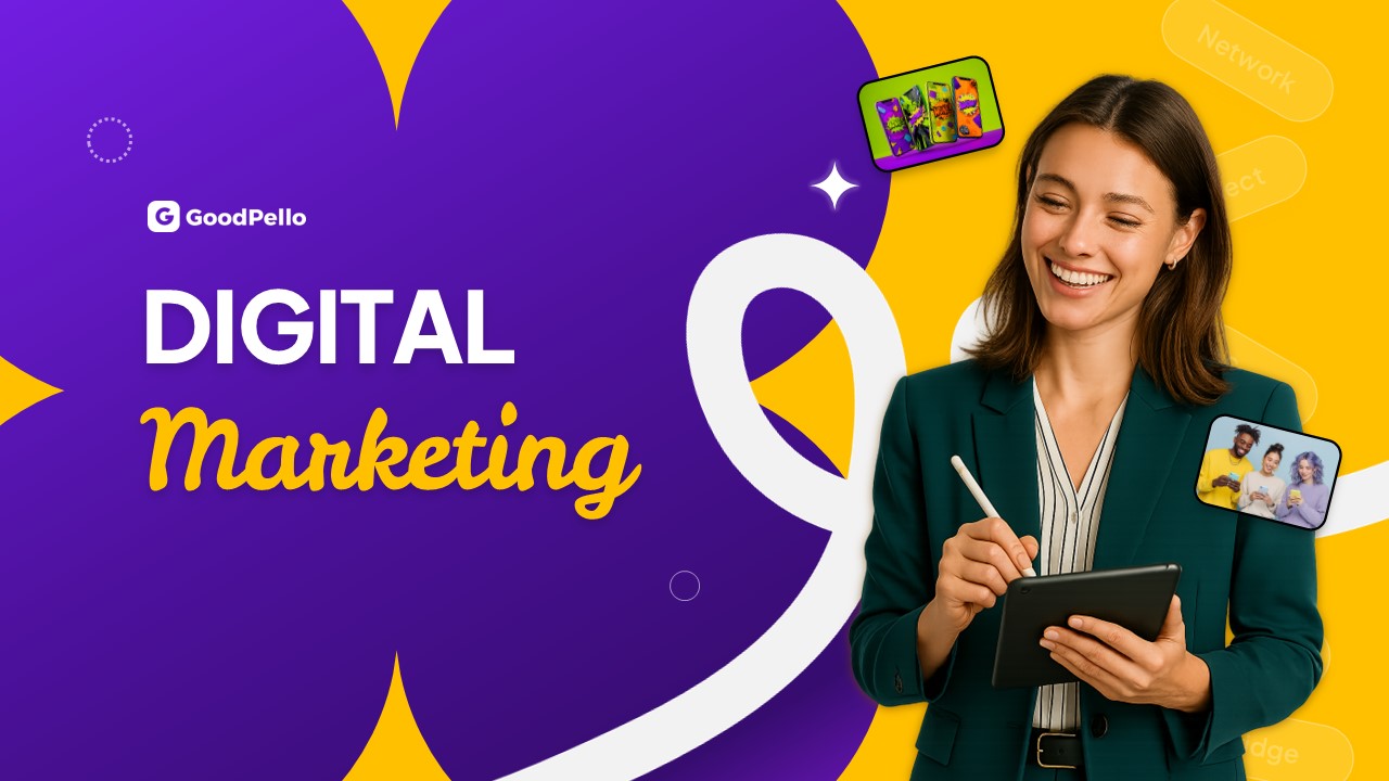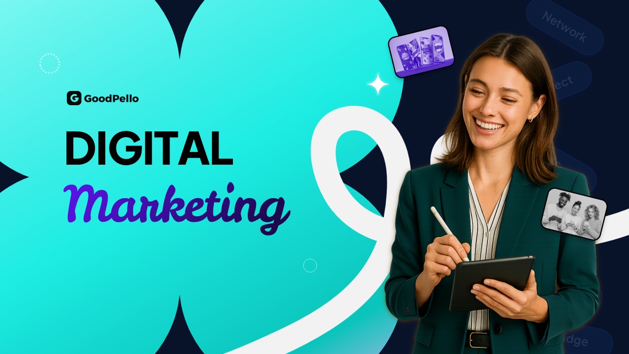 디지털 마케팅의 전반적인 개념을 소개하는 슬라이드입니다. GoodPello 브랜드와 함께 현대적이고 역동적인 디자인으로 온라인 마케팅의 다양성과 혁신성을 표현합니다. 태블릿을 활용하는 전문가 이미지와 생동감 있는 컬러 조합으로 디지털 시대의 마케팅 트렌드를 강조하며, 디지털 전략 발표, 마케팅 교육, 온라인 비즈니스 소개에 최적입니다.