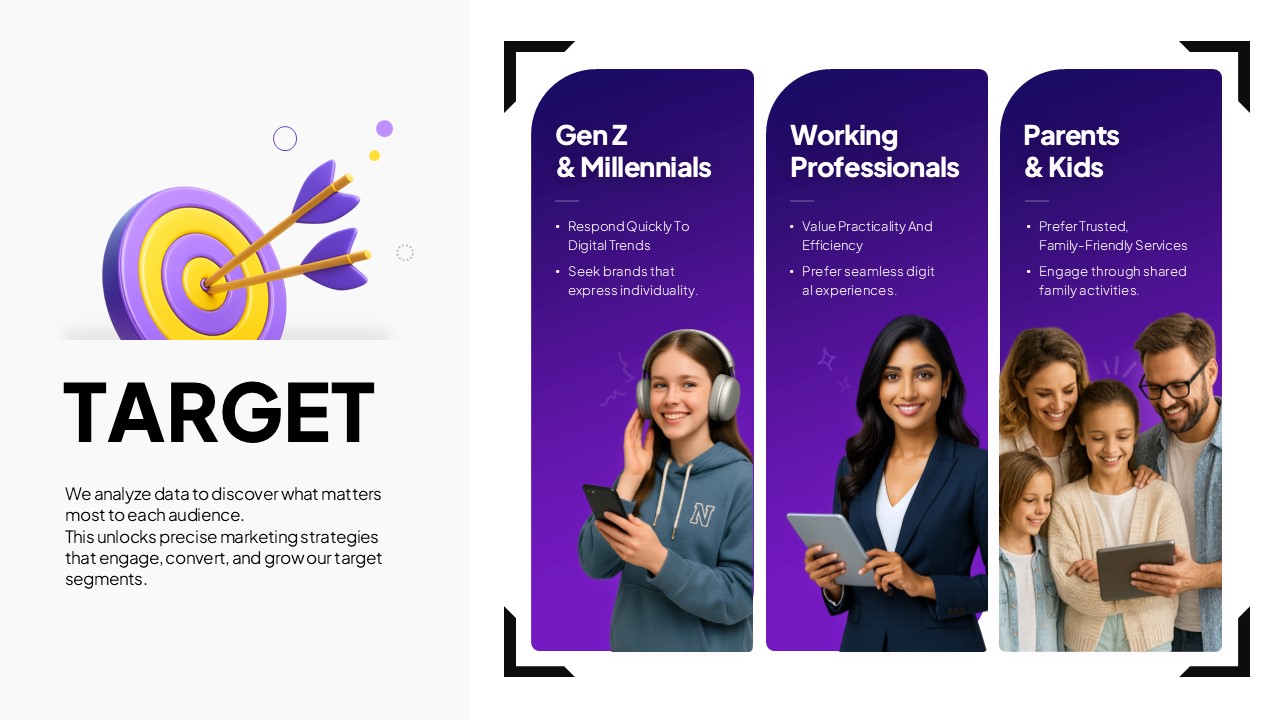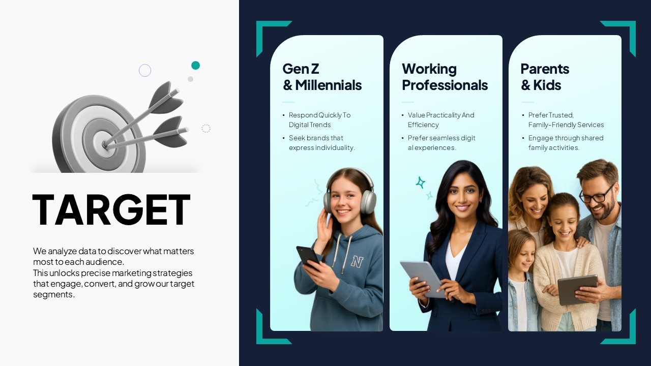 타겟 오디언스 세분화 전략을 명확히 보여주는 슬라이드입니다. Gen Z & Millennials, Working Professionals, Parents & Kids 세 가지 주요 고객군을 시각적으로 구분하고 각 그룹의 특성과 선호도를 설명합니다. 과녁 이미지로 정확한 타겟팅의 중요성을 강조하며, 마케팅 전략 수립, 광고 캠페인 기획, 제품 포지셔닝 발표에 효과적입니다.