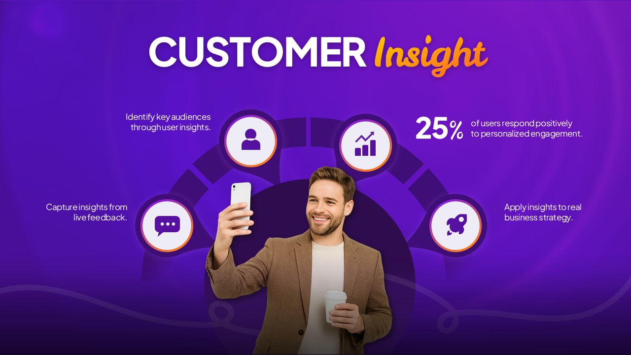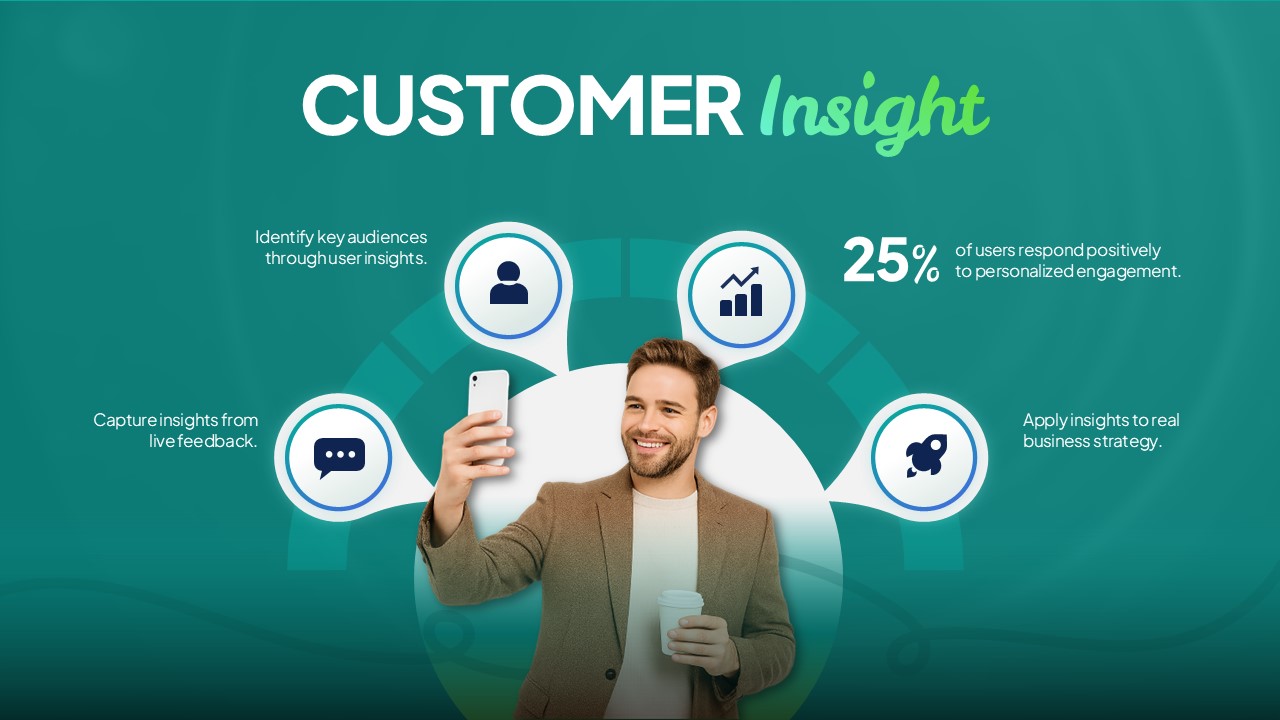 데이터 기반 고객 인사이트 분석을 표현한 슬라이드입니다. 사용자 아이콘, 차트, 피드백 아이콘을 통해 고객 데이터 수집과 분석, 개인화된 참여 전략을 시각화했습니다. 25% 응답률 통계를 포함하여 신뢰성을 더하며, 데이터 분석 프레젠테이션, 마케팅 전략 회의, CRM 솔루션 소개에 최적입니다. 고객 이해와 데이터 활용 전략을 명확히 전달합니다.