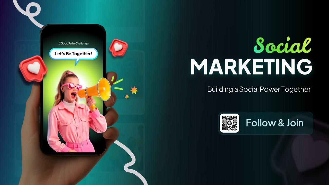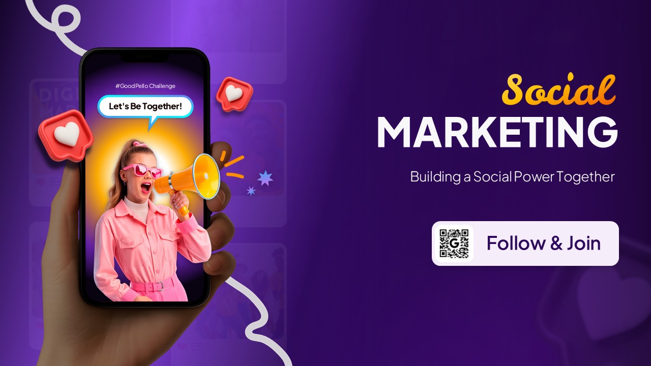 소셜 미디어 마케팅의 힘을 강조하는 슬라이드입니다. 스마트폰 화면과 챌린지 해시태그를 통해 소셜 파워 구축과 팔로우&참여 유도 전략을 표현합니다. 하트 아이콘과 밝은 캐릭터로 긍정적인 커뮤니티 분위기를 조성하며, SNS 캠페인 기획, 인플루언서 마케팅, 바이럴 마케팅 프레젠테이션에 최적입니다.
