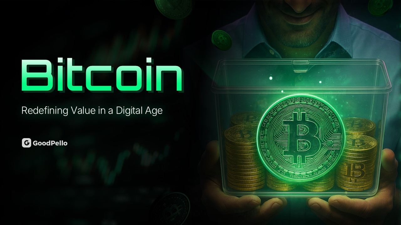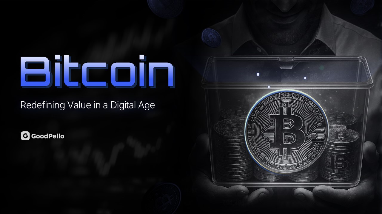 "디지털 시대의 가치를 재정의하다"는 메시지로 비트코인의 혁신성을 강조하는 슬라이드입니다. 투명한 용기에 담긴 비트코인 이미지가 디지털 자산의 실체감을 전달하며, 브랜드와 함께 비트코인의 미래 가치를 설명합니다. 암호화폐 투자 설명회, 비트코인 교육, 핀테크 세미나에 최적입니다.